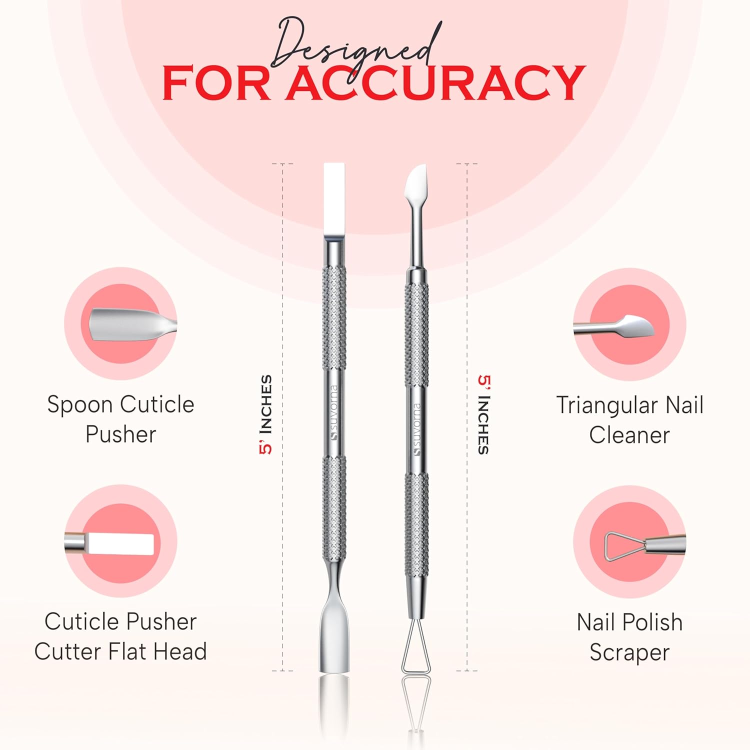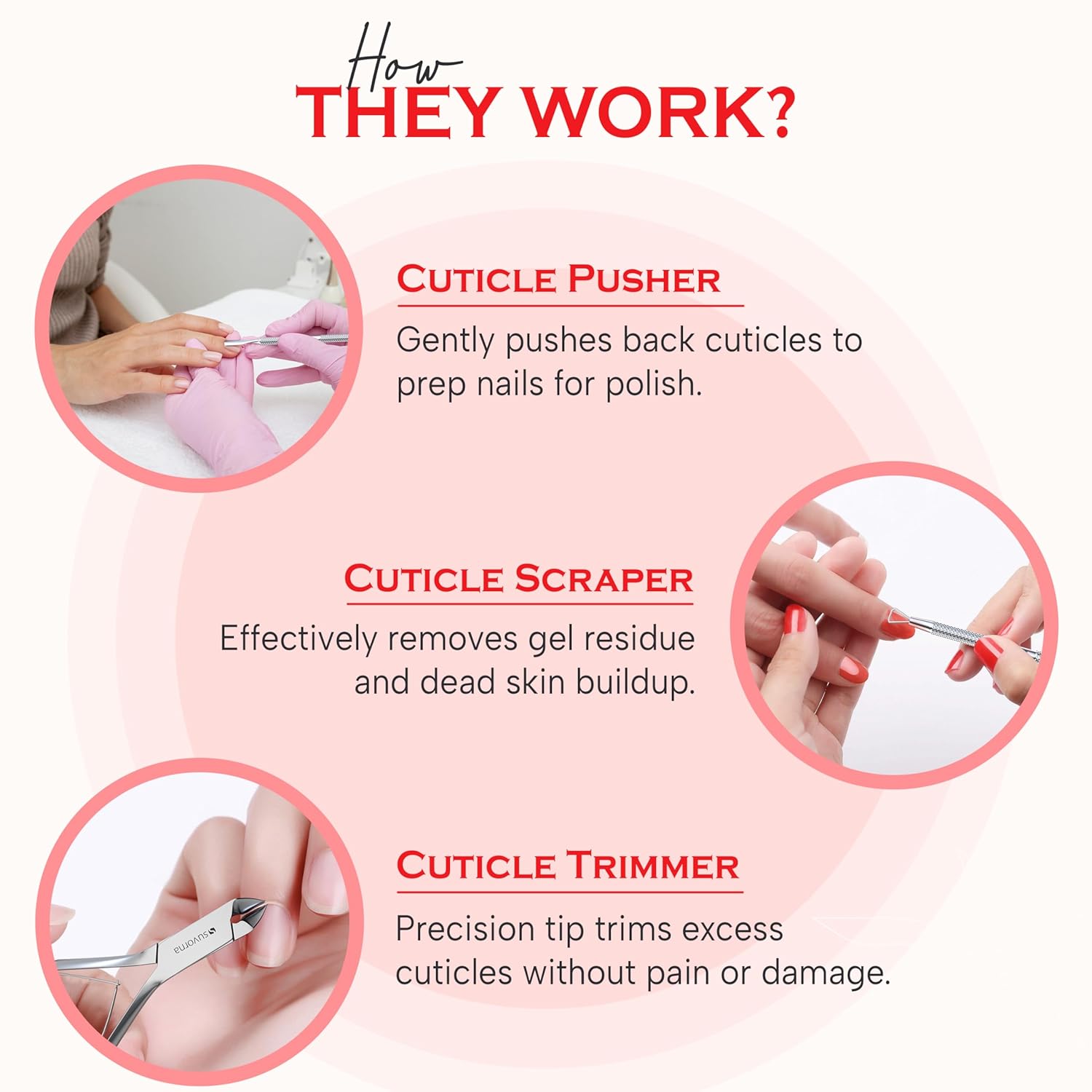 - β Premium Stainless Steel Craftsmanship: Built with upgraded polished stainless steel, this professional 5-in-1 cuticle trimmer set includes a cuticle trimmer, cuticle pusher, cuticle cutters for nails, nail scraper and gel remover. Sharp, rust-resistant, and long-lastingβperfect manicure tools for fingernails, dead skin, and cuticle maintenance.