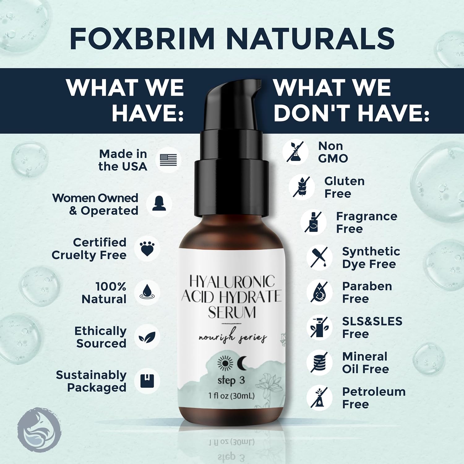 - MADE IN USA FOR ALL SKIN TYPES - Our Hyaluronic Acid Serum is fully Vegan, Cruelty-Free, never tested on animals and bottled in USA only in small batches. Does not contain any kind of additives such as parabens, alcohols, sulfates, artificial scents, phthalates, dyes, and talc. Suitable for all skin types, including sensitive, oily, dry, and combination skin