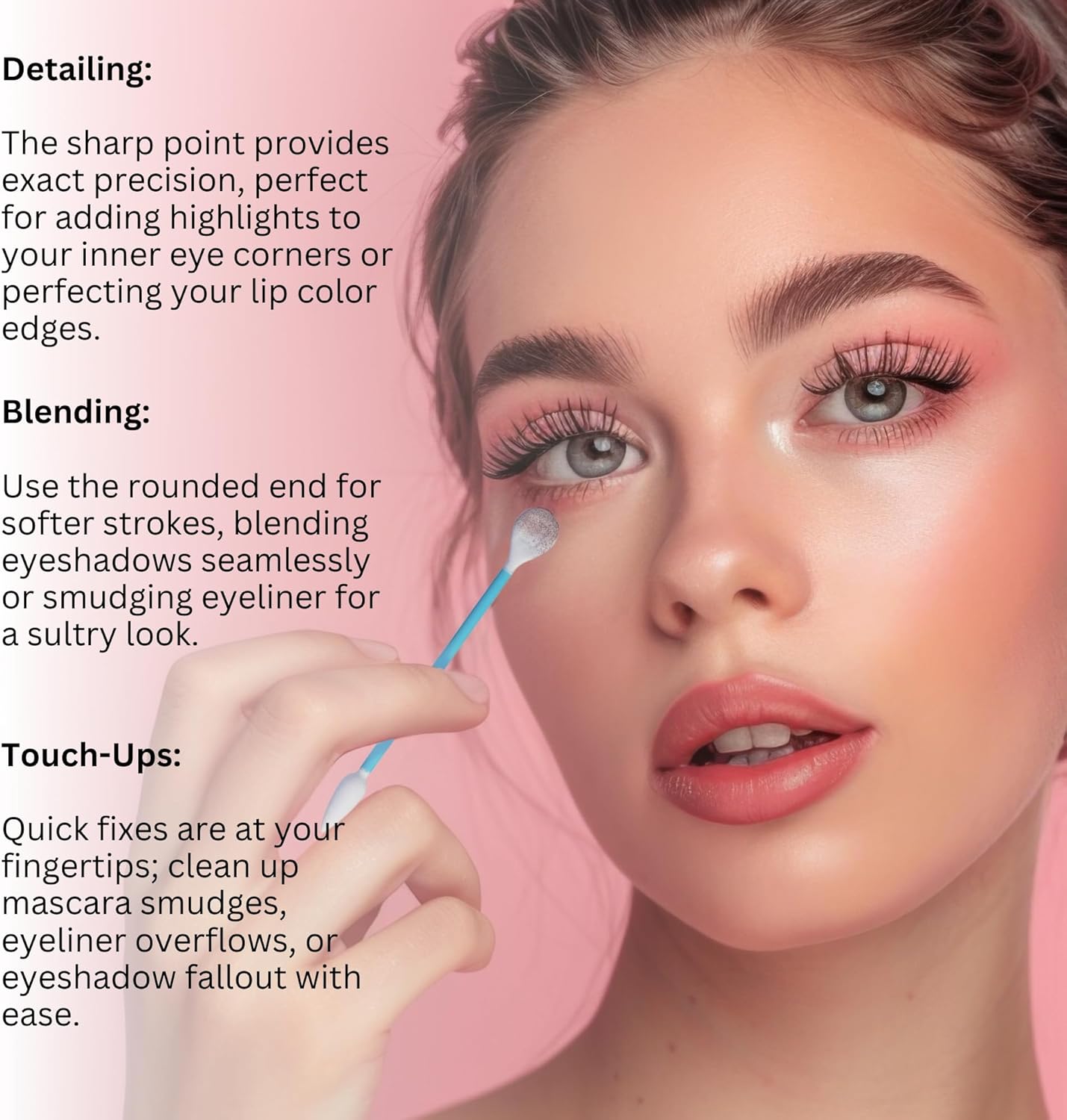 - PRECISION MAKEUP APPLICATOR - soft, double-sided cotton swabs pointed at one end, rounded at the other, for precision application, perfect blending and gentle, effective cleaning.