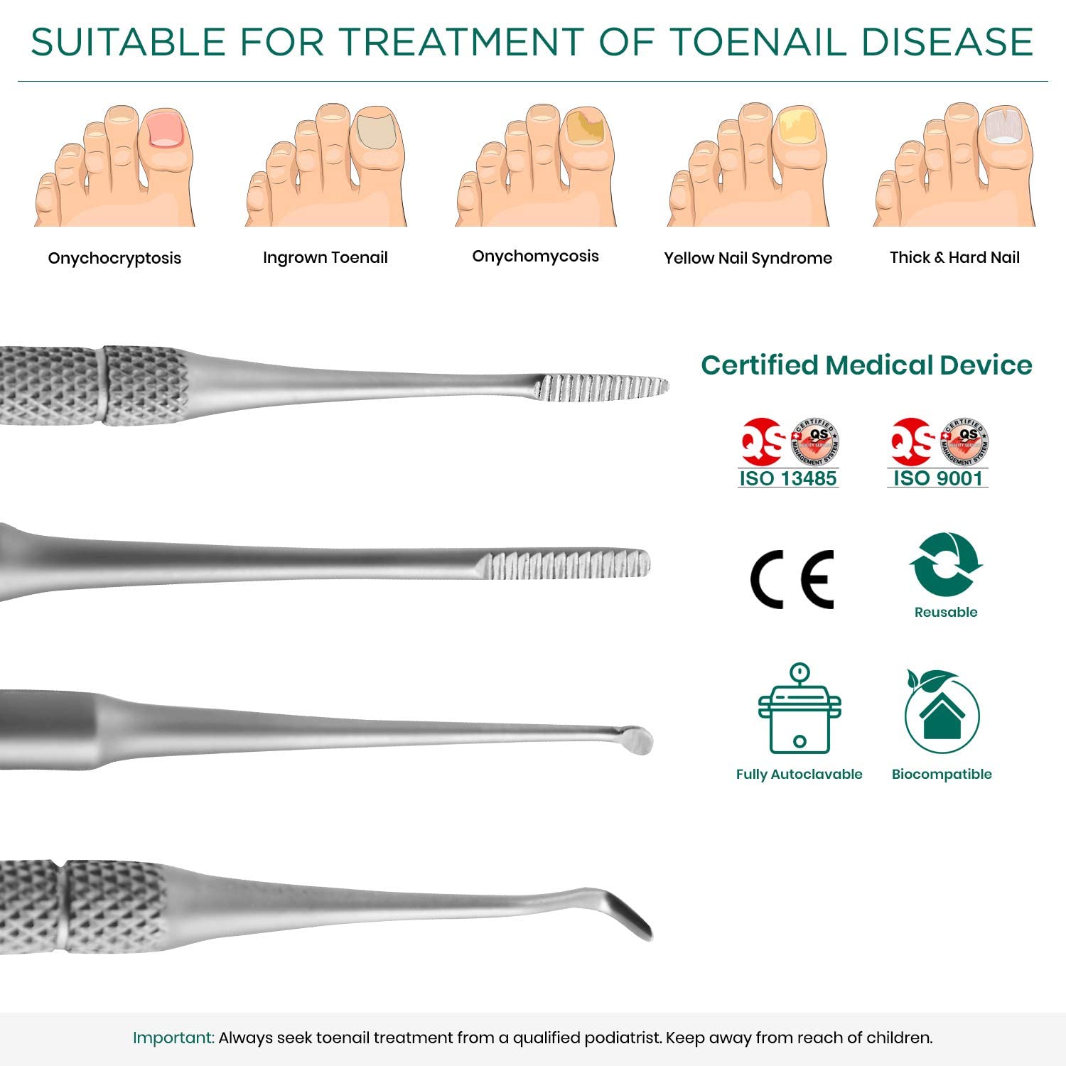 - Hospital grade medical device set: Our reuseable, fully autoclavable podiatry instruments are made from rock-hardened stainless steel to the highest quality standards; ISO 13485 and CE certified