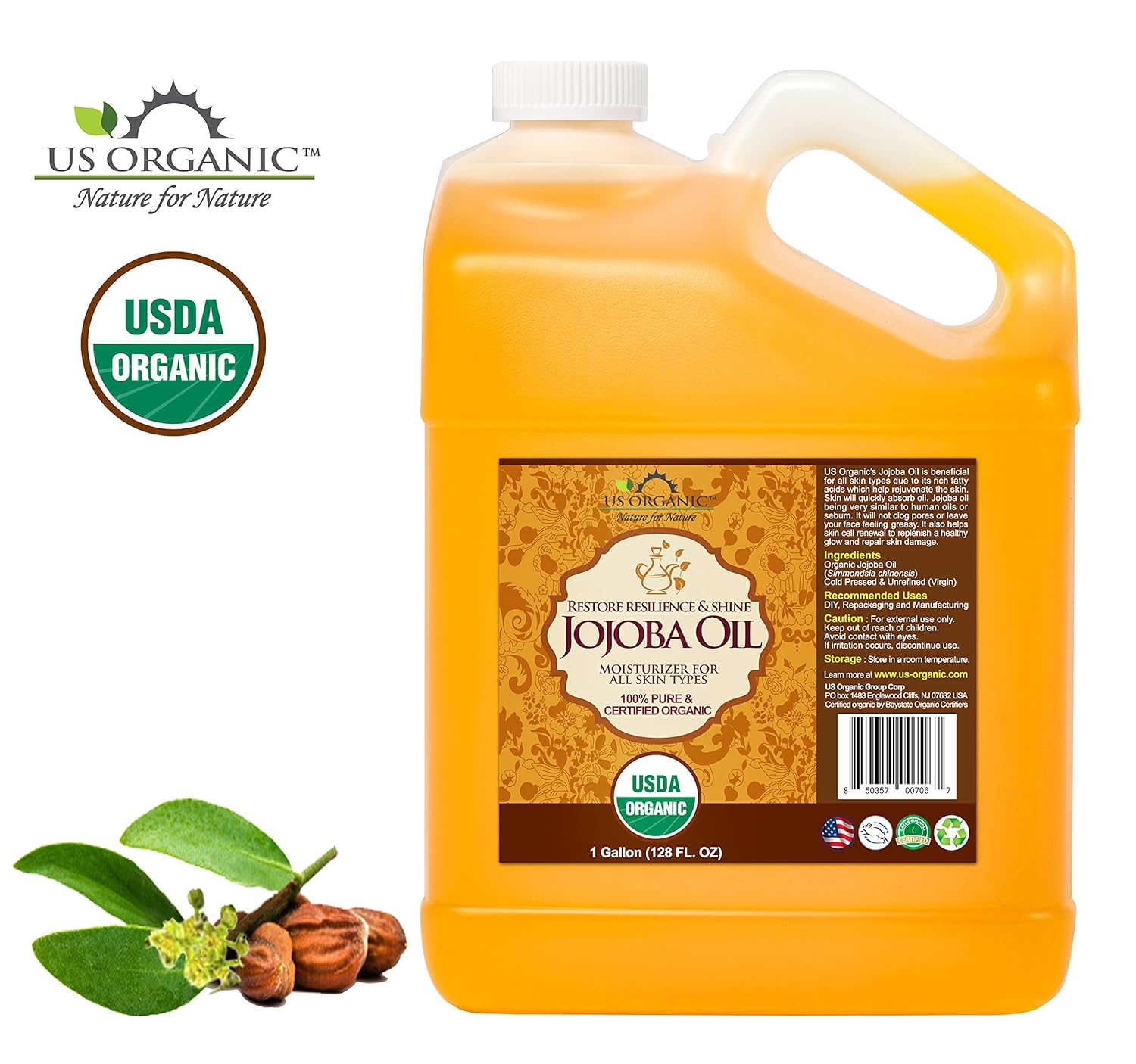 US Organic Jojoba Oil, USDA Certified Organic,100% Pure & Natural, Cold Pressed Virgin, Unrefined, Haxane Free, Sourced from Middle East, Size for DIY and Small Manufacturers (128 oz (1 Gallon))
