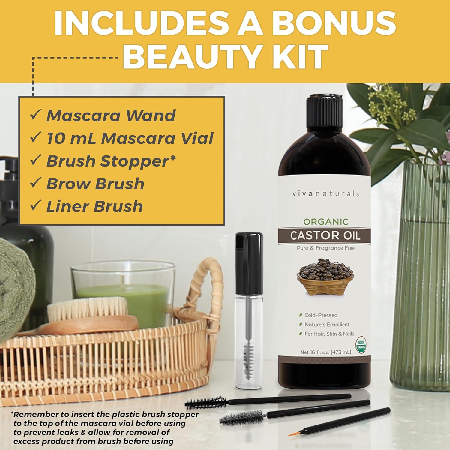 - ✔️BEAUTY KIT WITH LASH & BROW BRUSHES – Each bottle of organic castor oil comes with a complete beauty kit (mascara wand, 10 mL mascara vial, brush stopper, brow brush & liner brush) for all your at-home beauty needs.