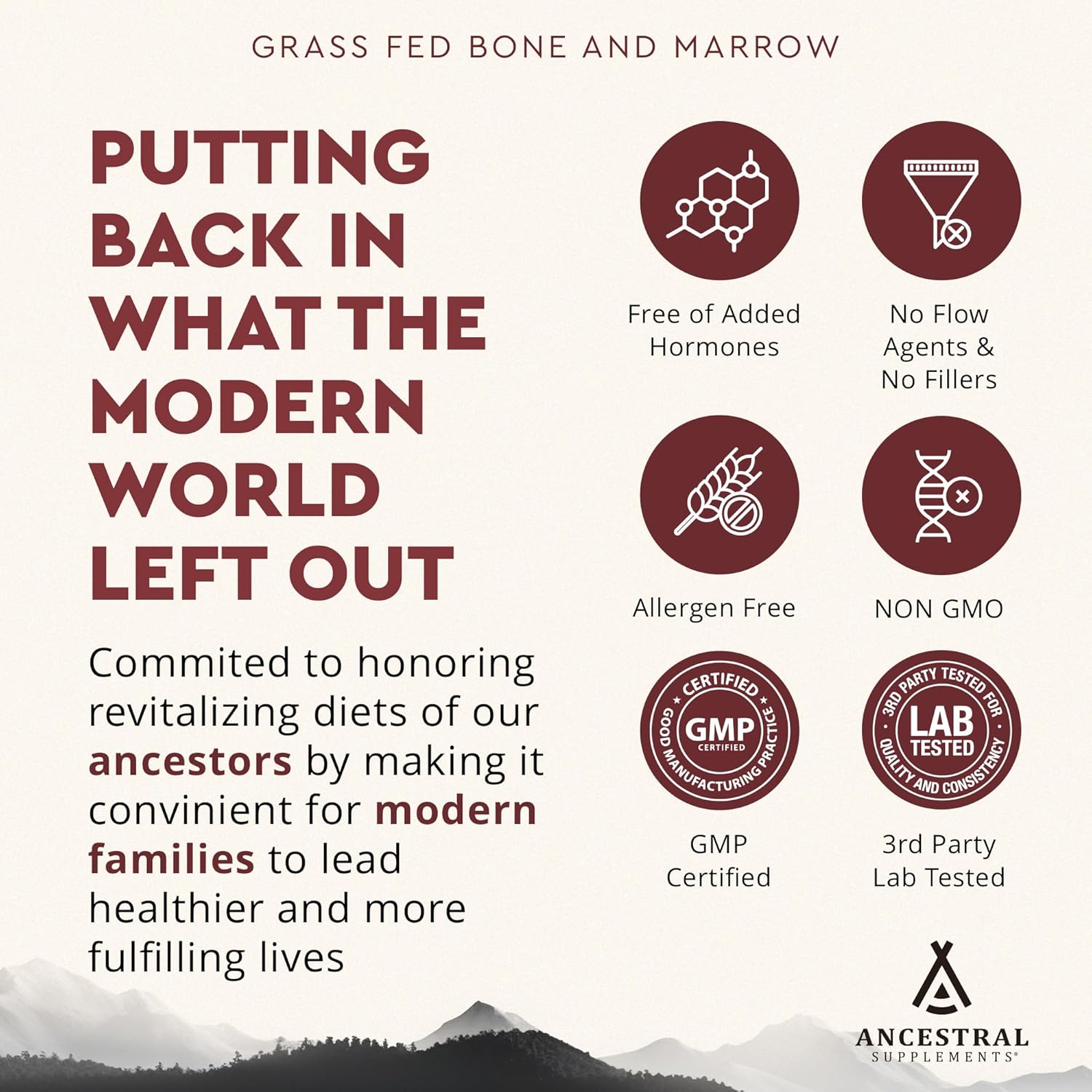 Ancestral Supplements Grass Fed Beef Bone and Marrow Supplement, 3000mg, Skin, Oral Health, and Joint Support Supplement, Promotes Whole-Body Wellness, Non GMO Whole Bone Extract, 180 Capsules