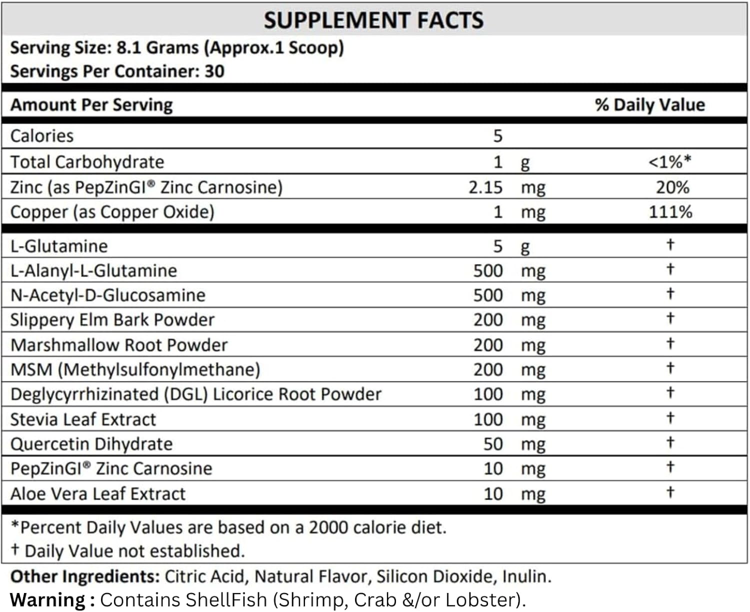 - SUPPORTS DIGESTIVE HEALTH: Terra Origin Healthy Gut Powder is designed to alleviate stomach discomfort and improve digestion. Featuring PepZinGI (Zinc Carnosine), L-Glutamine, Glucosamine, and herbal extracts like Slippery Elm Bark and Marshmallow Root, it soothes the digestive tract and promotes stomach comfort by reducing bloating and cramping.