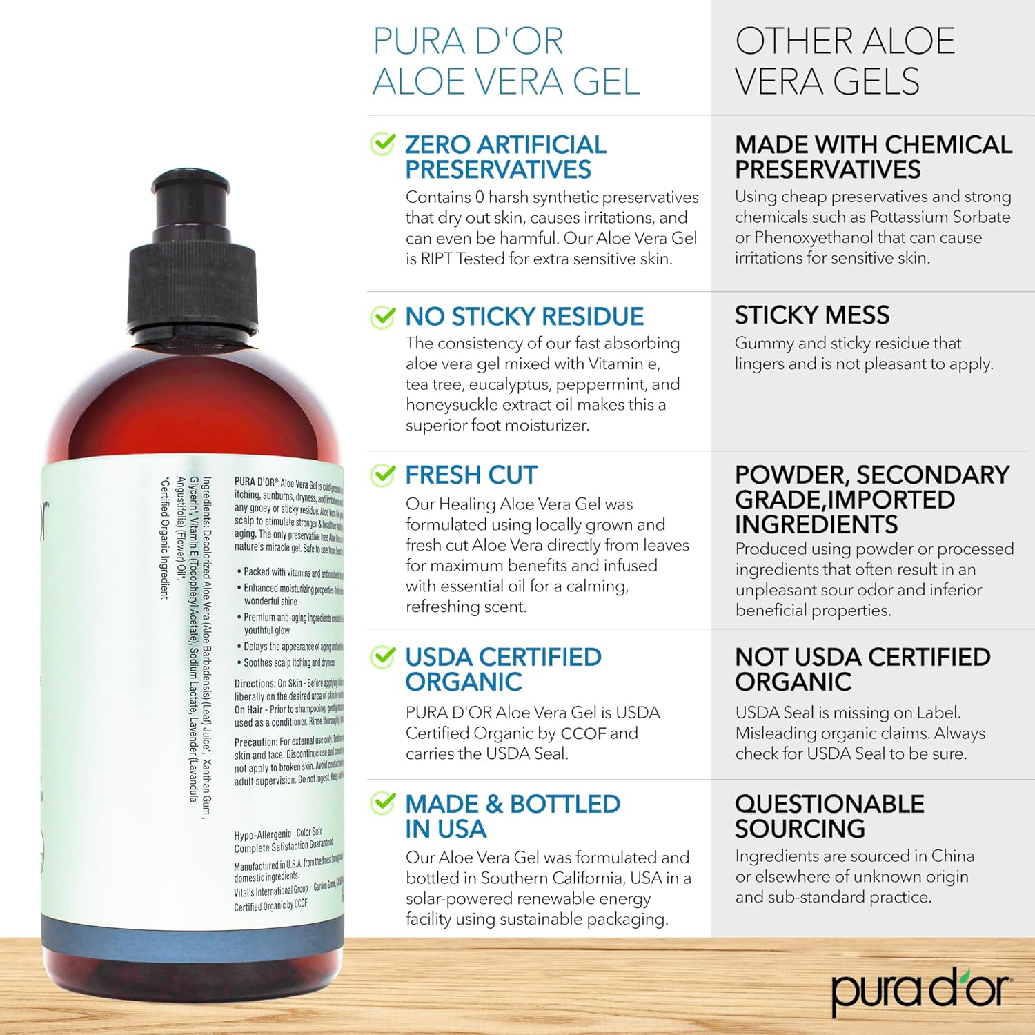 - THE ONLY USDA ORGANIC ALOE VERA GEL ON THE MARKET: PURA D'OR is the Only USDA Certified Organic Aloe Vera Gel on the market currently that has ZERO artificial preservatives and does NOT require refrigeration. Other brands are missing USDA Organic Seal on the Label which means they are not Certified Organic and any Organic claims made elsewhere are misleading and inaccurate. Always check for USDA Seal on Label
