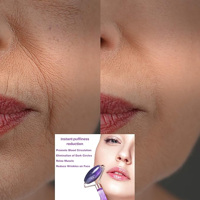 - Designed In USA! Amethyst crystals have tremendous benefits for your health and skin, the combination of mask, face roller and gua sha in. this set work together to diminish puffiness, promote relaxation and sleep, help with headache and migraine, eye strain and fatigue, dark circles, and many more.