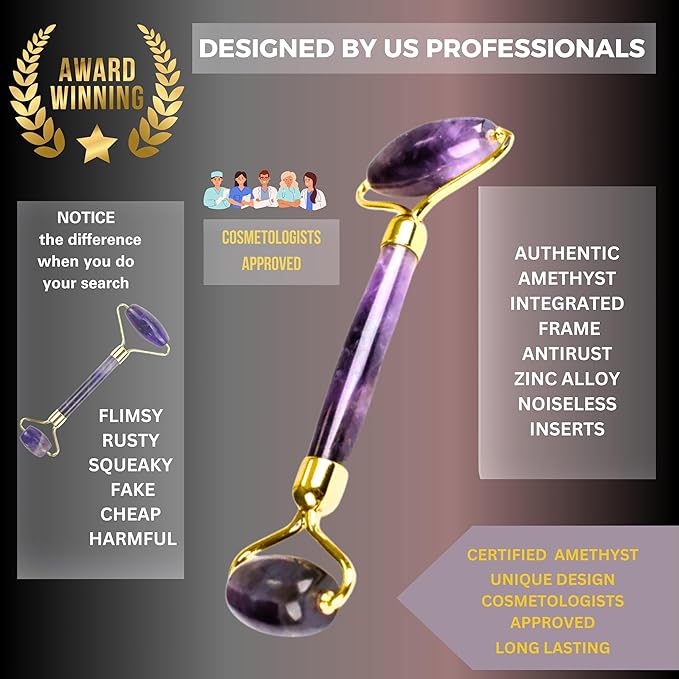 - Bonus Amethyst Guasha & Jade Roller - Noisless & Smooth USA Quality : We’ve seen those Jade Rollers too, you know the ones that squeak and break. This, is not those.But we use a hard, stainless steel integrated frame (all one piece) and two tiny “wheels” that we insert in the head of the roller which turns your roller smoothly and without a noice..