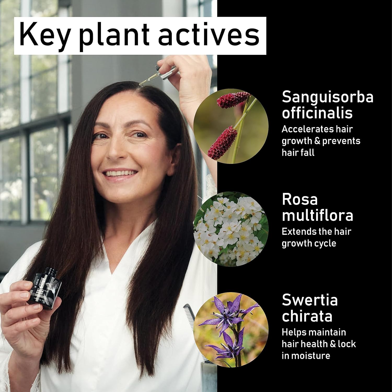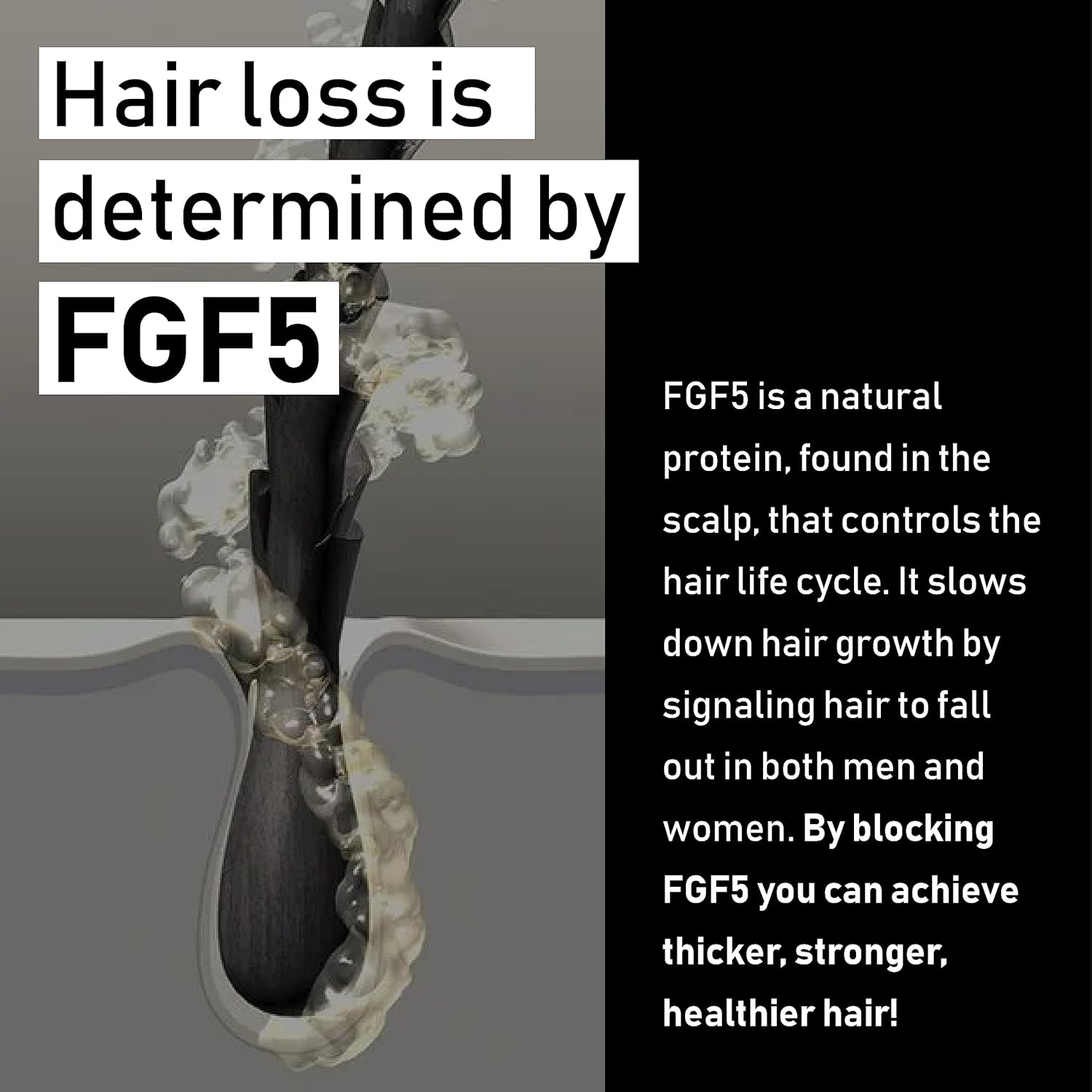 - Proprietary Blend with Hair-Nourishing Botanicals – A powerful scalp serum infused with a blend of antioxidants, rosemary oil for hair growth, natural hair thickening products, and FGF5 blocking botanicals, a key protein responsible for hair loss, to strengthen hair and extend the hair’s natural growth cycle. The self-dosing pipette ensures precise application, with one bottle lasting up to 8 weeks.