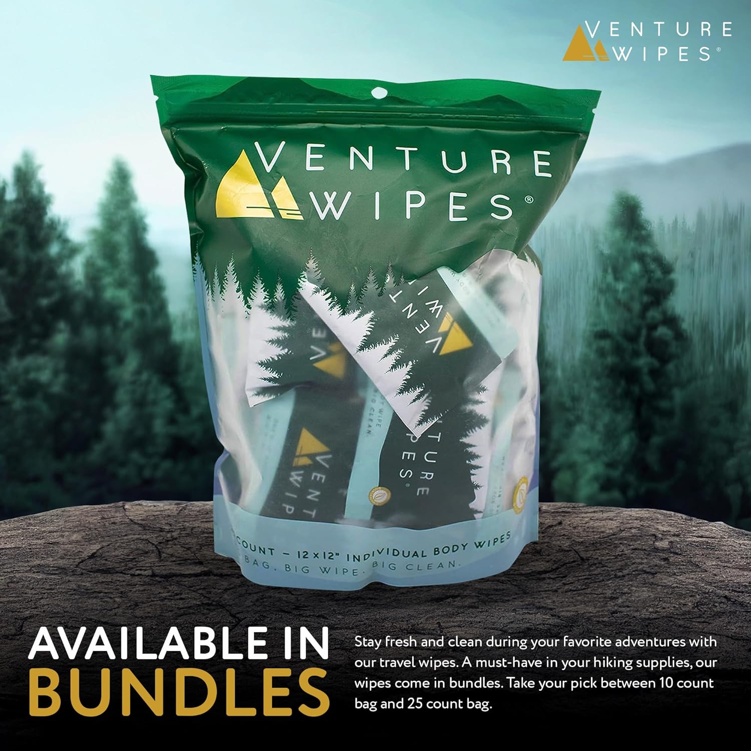 - EASY TO USE: Prepare for a breeze of cleanliness with Venture Wipes. Our wet wipes are thoughtfully packaged in individual pouches for utmost convenience. Whether you're on a waterless adventure like hiking or camping, or need a quick refresh for your furry friend or post-workout at the gym, these wipes have got you covered!