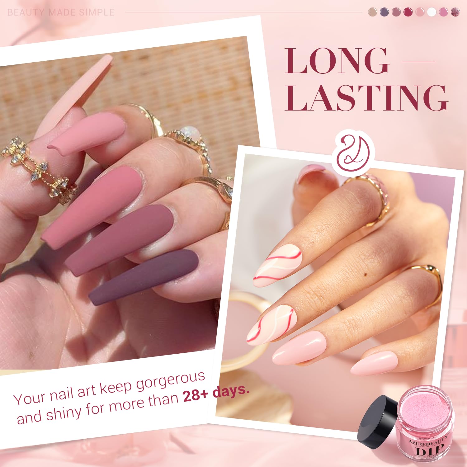 - 【Long Lasting Vibrant Shades】Azurebeauty nail dip powder kit starter set is long-lasting and anti-chipping, anti-peel off. The color is full and natural-looking, light, and has an impeccable shine finish. It can keep the nail art gorgeous and shiny for more than about 28 days with proper application.