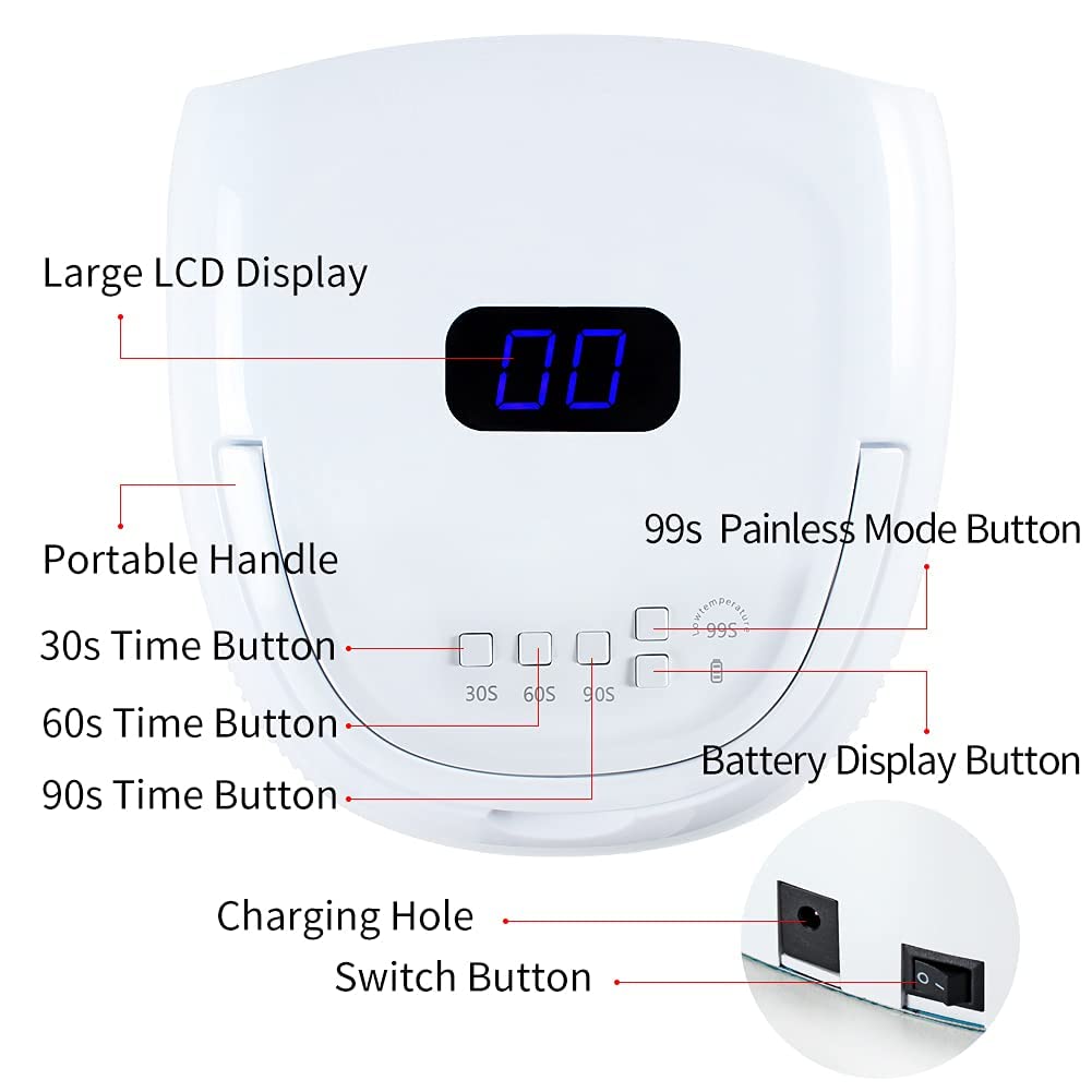 - 4 Timer Setting and Smart Sensor: The built-in LED display shows the nail drying time, you can know the time of curing gel nails to achieve a better effect. Have 3-time settings, the 30s, 60s, 90s,99s for your choice, more convenient to use. And have a smart infrared sensor, the LED nail light could be automatic sensing, hands in light on, hand out light off, can save power and protect your hands.