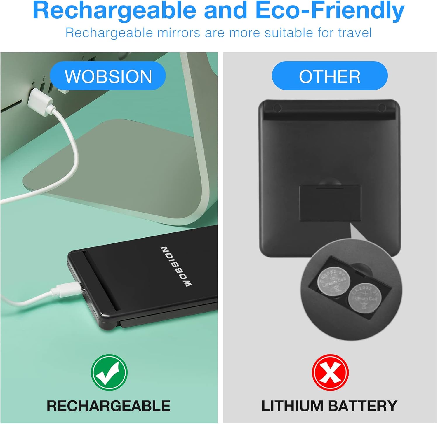 - Recharable Compact Mirror:No need batterys,long lasting,one charge can last for 4-5 hours,only takes 1-2 hours to fully charge.Rechargeable models are more travel-friendly than battery-powered ones