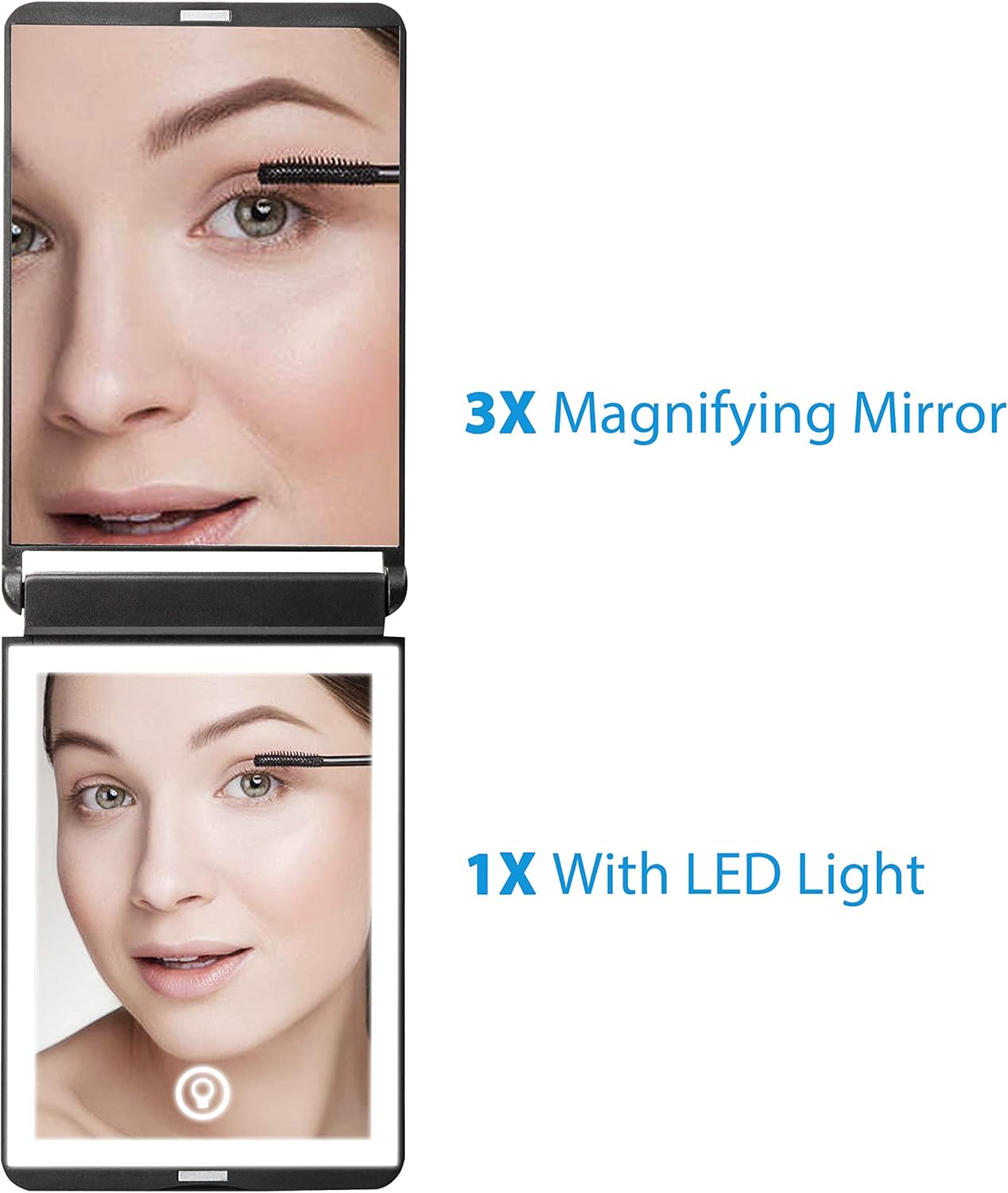 - 300°Flip Folding Mirror:This travel makeup mirror can achieve a 300-degree flip, so whether you want to use the magnified mirror or the illuminated mirror, you can place it at will.Can be handheld or stand on