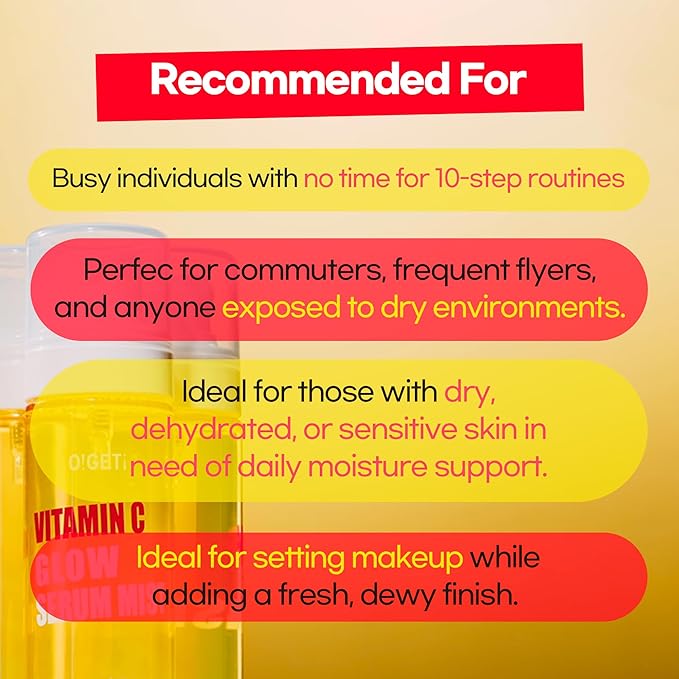 - π[Glow Skin] Perfect to start or end your day with, or even as a mid-day refresher. O!GETi Vitamin C Mist Serum is formulated with nutrients designed to restore hydration and healthy skin.