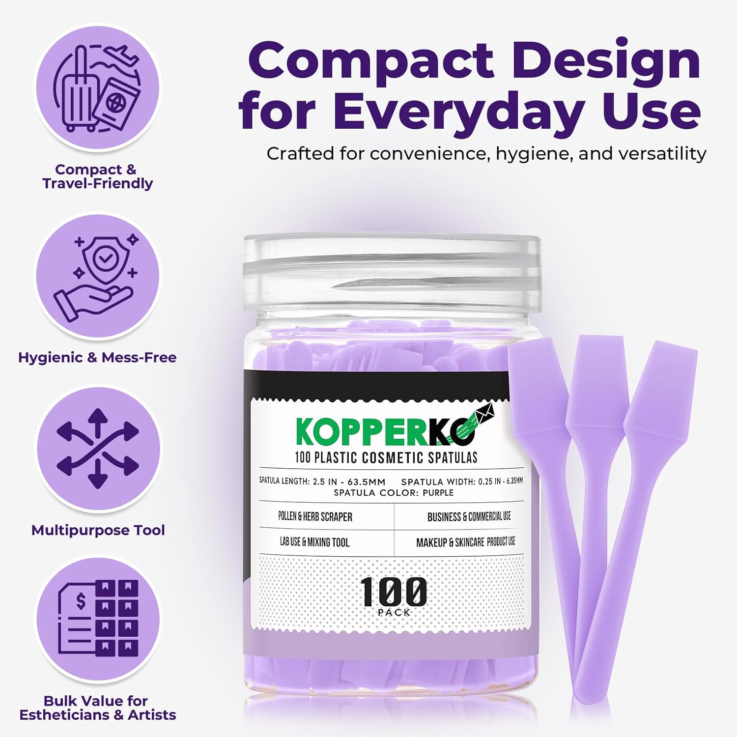 - Clean Out Your Containers: Maximize product use with our 100 pack of 0.25"x2.5" disposable cosmetic plastic spatulas. Easily extract creams, lotions, or makeup from containers, even in tight spaces, without getting product under your nails