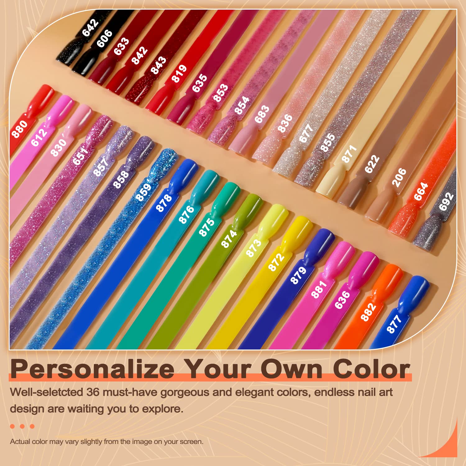 - Get a brilliant shiny nail finish with Lavender Violets dip powder nail kit, it includes 36 jar of glitter and solid rainbow colors acrylic dipping powder (0.34oz/each jar), perfect for all seasons dip manicure looks and pastel nail colors. 【Reminder】The Dip Powder Gel Liquid Set is Not included.