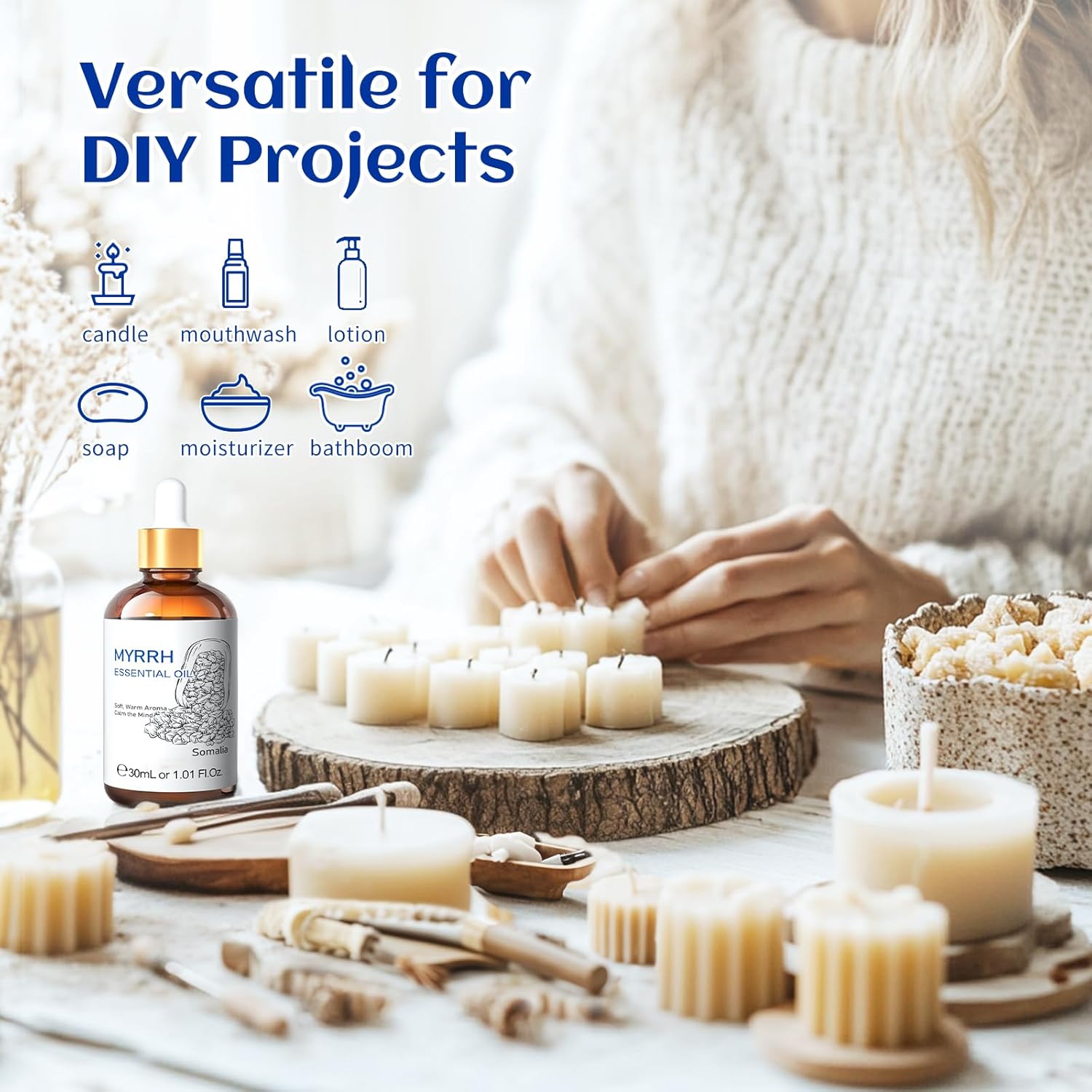 - DIY: Add myrrh oil to massage oils, candles, aromatherapy, diffusers, diffusers, sprays, body lotions, creams, serums, bath salts and soaps