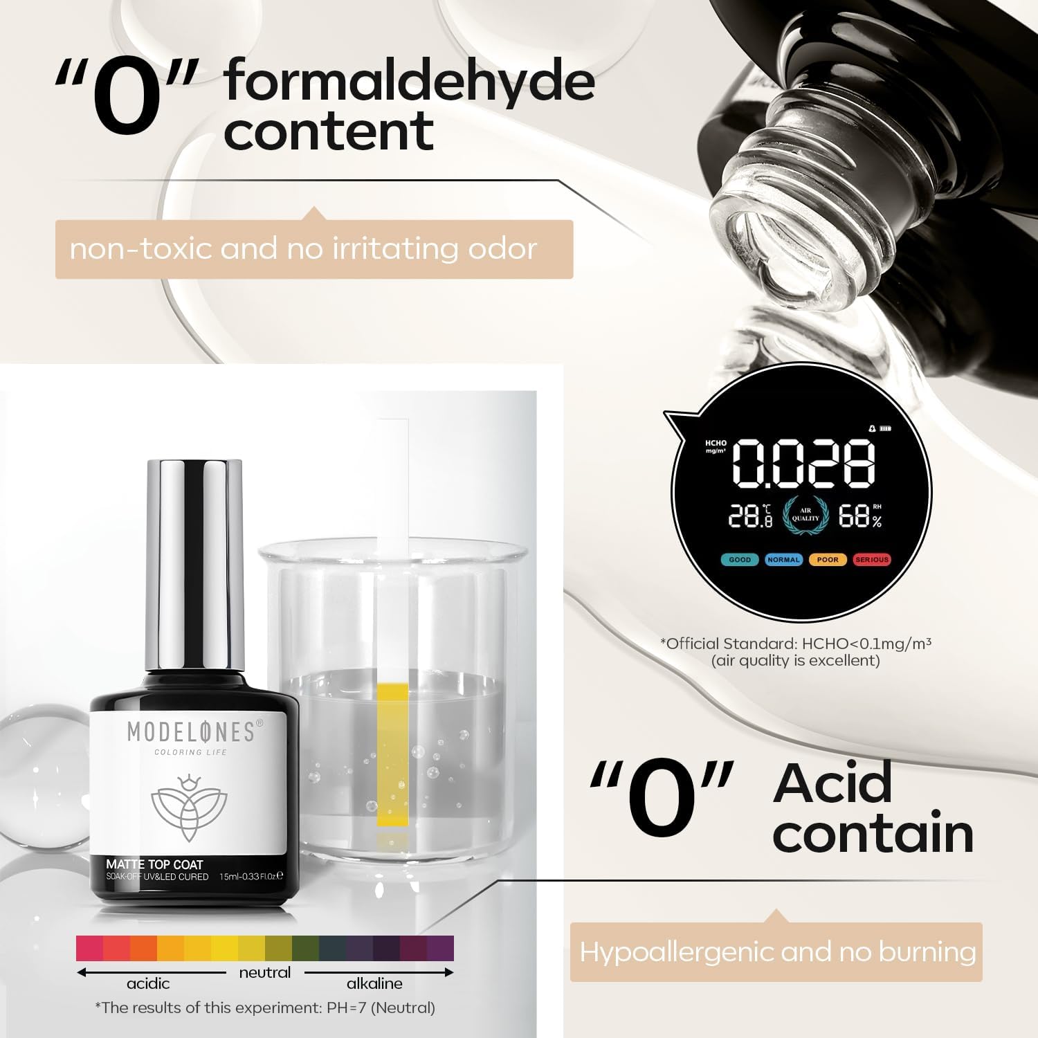 - Upgraded Formula: Modelones Matte Top Coat Gel Polish is made of upgraded formula, which can better cope with the problems that other top coats met, avoid nicks, chips and smudges, bringing you a perfect matte effect.