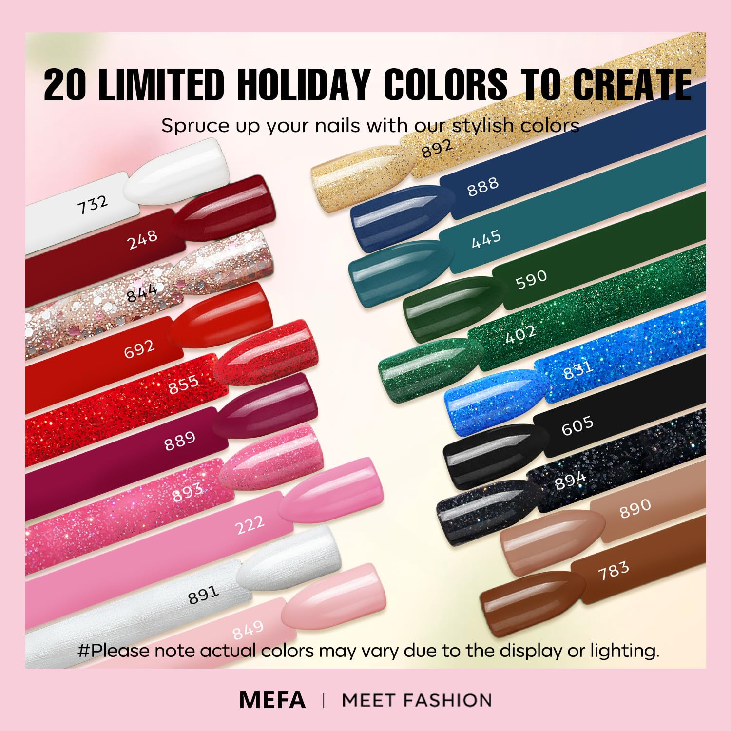 - 23 Colors Gel Nail Polish Set: MEFA exquisite 20+3 colors gel polish set, includes 20x7ml colors Gel + 3x7ml glossy matte top base coat. MEFA has incorporated the popular colors, burgundy red, forest shimmer green, silver rose gold glitter into this product
