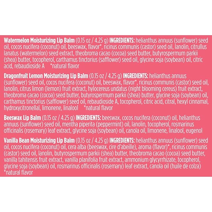 - FOUR REFRESHING FLAVORS: Delight the senses with Watermelon, Dragonfruit Lemon, Beeswax and Vanilla Bean flavors that will encourage you to apply flavored lip balm over and over again