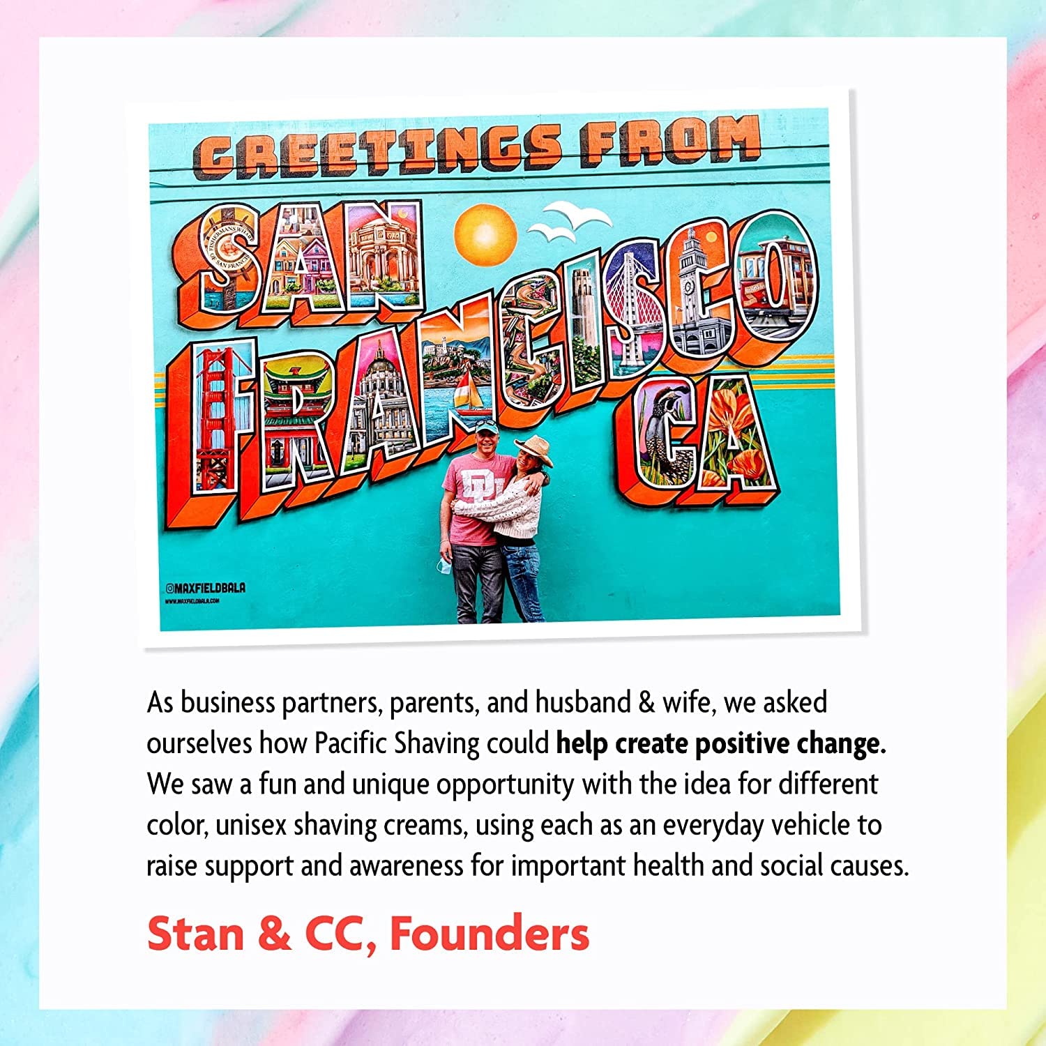 - Shave with Purpose - As business partners, parents, and husband & wife, we asked ourselves how Pacific Shaving could help create positive change beyond just superb shaving cream for men. We saw a fun and unique opportunity with the idea for different color unisex shaving cream women and men would love. Oh, and did we mention they make great sensitive skin shaving cream?