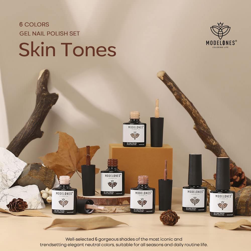 - Designed in the US & Best Nude Brown Gel Nail Polish Forward: Modelones 6 Colors 7ml (0.24oz) Big Capacity nude brown nail polish is chosen from 108 sheers, opaque, shimmer, metallic, and chrome shades. We have every color you need to create any nail look, a shade for every mani-pedi occasion, easy to match any style of your outfits.You can achieve the best salon look from the comfort of your own home.Modelones gel polish is a perfect gift for Halloween.