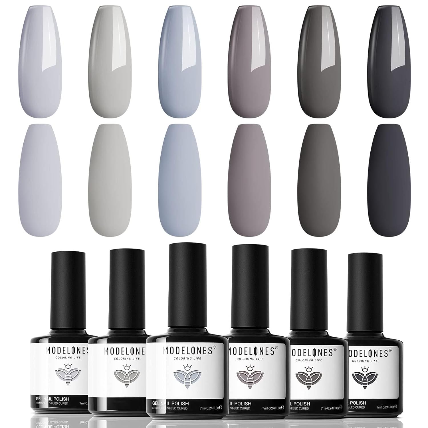 - Design in the US & New Pigmented Gel Polish: 6pcs x 7ml/0.24oz Modelones gel nail polish kit, inspired by 6 trendy colors pastel grey black nail polish set with the color numbers below which is suitable for daily use at all seasons