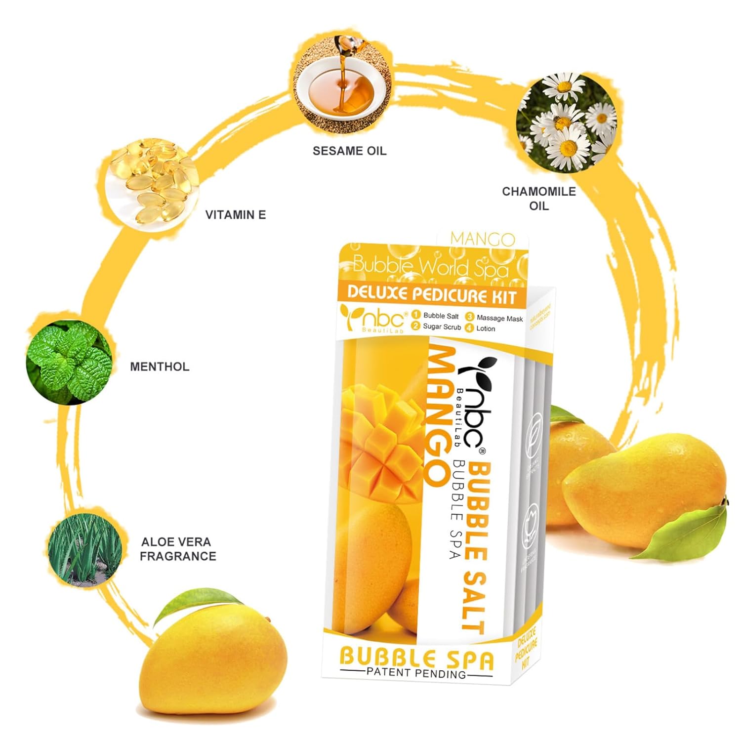 - 🥭[Package Includes]: Exfoliating Foot Spa Pedicure Kit consists of Bubble Salt, Sugar Scrub, Massage Mask, and Massage Lotion for a 4-step foot spa at home. Formated to be gentle on the skin, you are sure to feel your skin feeling soft and supple after use.