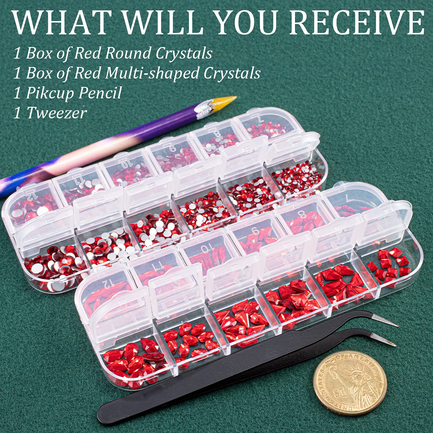 - ❤WHAT YOU WILL RECEIVE -- 1 Box of 6 Sizes Red Round Glass Nail Crystal Rhinestones Beads (Totally About 1720 PCS); 1 Box of 12 Different Shaped Styles Red Glass Stones Gem (About 120 PCS; 10 PCS for Each Shape); 1 PCS Rhinestone Picker Pencil; 1 PCS Tweezer. The Well Equipped Rhinestone Set Is Suitable for Both Professional Nail Technician and Inexperienced Starter for Nail Art.