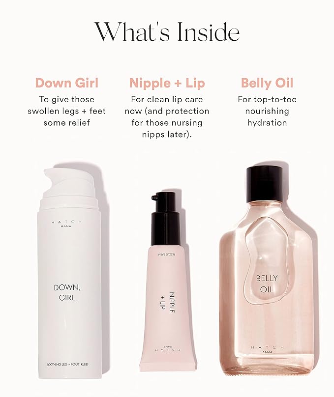 - MAMA MUST HAVES: The perfect maternity essentials kit for current and expecting moms. This 3 piece set comes with our popular Belly Oil, Nipple + Lip Rescue Balm, and our Down Girl Soothing Leg + Foot Relief.