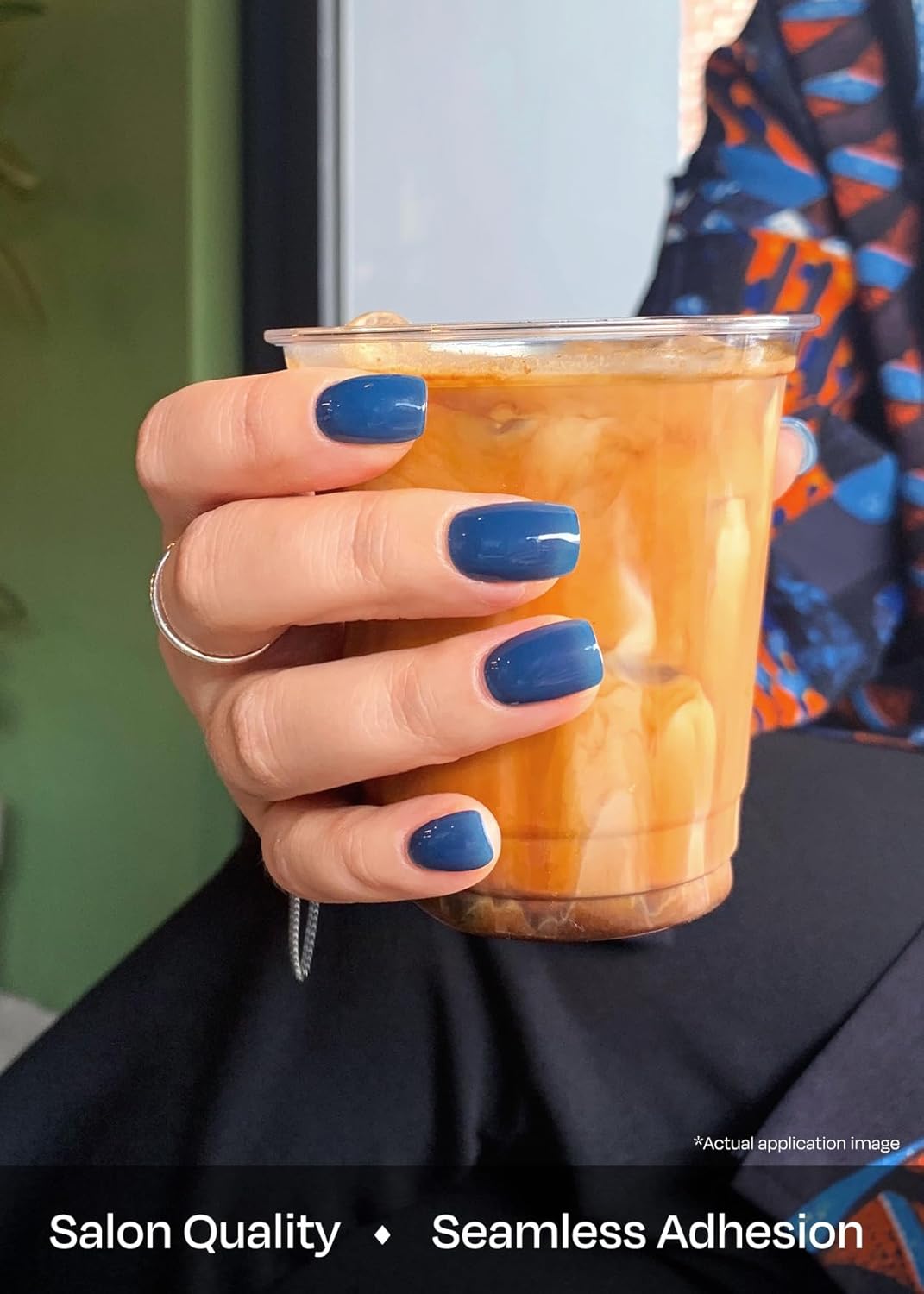 ohora Semi Cured Gel Nail Strips (N Cream Indigo) - Blue, Solid, Works with Any UV/LED Lamps, Salon-Quality, Long Lasting, Easy to Apply & Remove - Includes 2 Prep Pads, Nail File & Wooden Stick