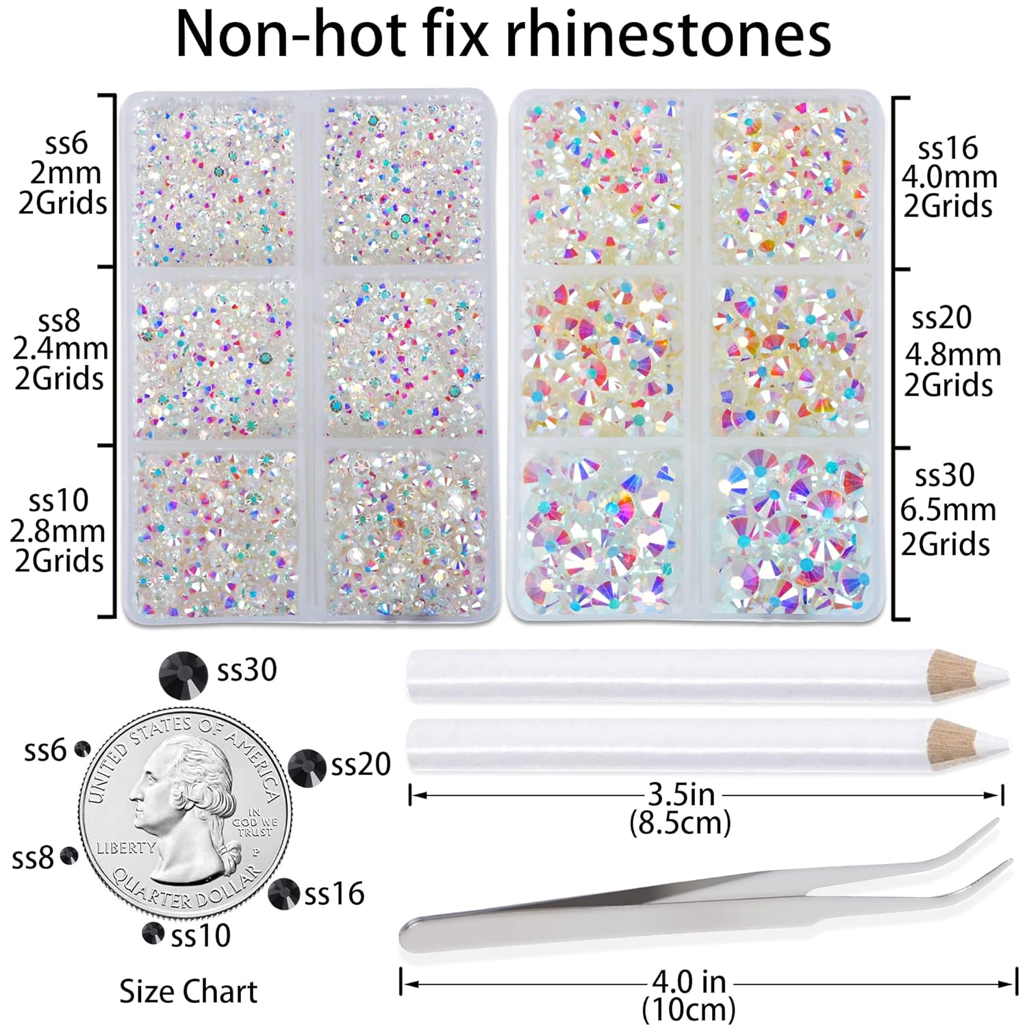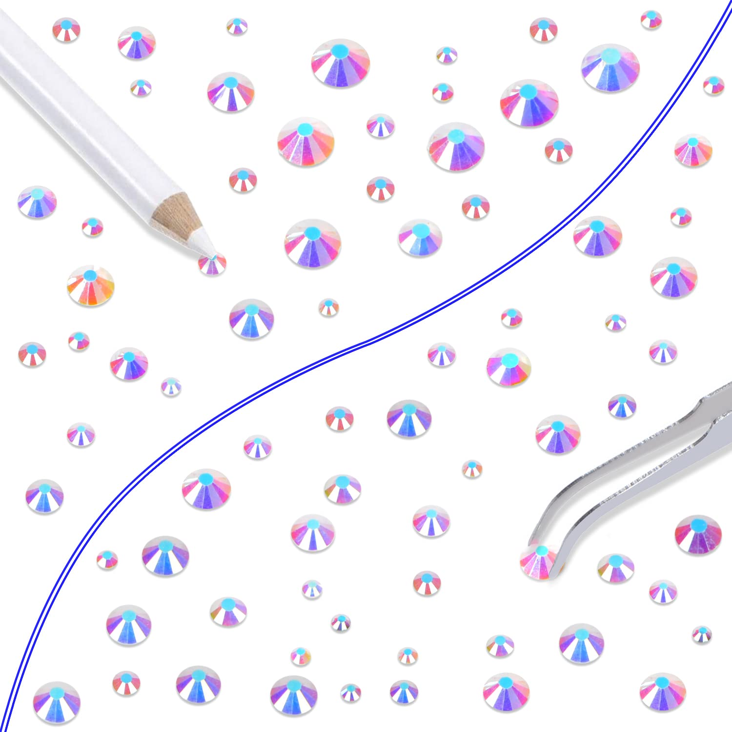 - Approx 6000 pcs of good quality sparkly flatback glass rhinestones with tweezers and 2 picker wax pencils help you easily pick up and set rhinestones in all your jewelry.