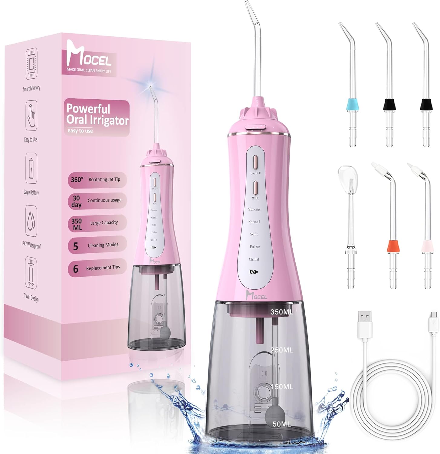 Water Dental Flosser for Teeth - 350ML Large Tank 5 Modes & 6 Tips Cordless, Oral Irrigator Waterproof, Portable Teeth Cleaning and Flossing with Effective Plaque Remover for Adults (Pink)