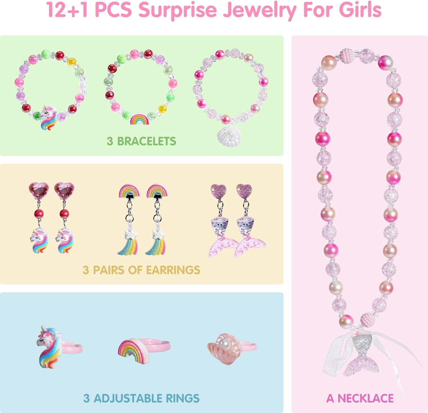 - 【Bath Bombs with Surprise Jewelry Inside】Each bath bombs for kids contains a mermaid or unicorn themed jewelry inside. The jewelry includes 3 adjustable rings, 3 pairs of clip-on earrings, 3 bracelets, and each gift set comes with a necklace, totally 13 pcs jewelries. Our jewelry are made of safe material and do not cause choking hazard. Girls will get a full set of jewelry gift, and both mermaids and unicorns are favorites of the girls. It’s a magic token that turns a girl into a princess.
