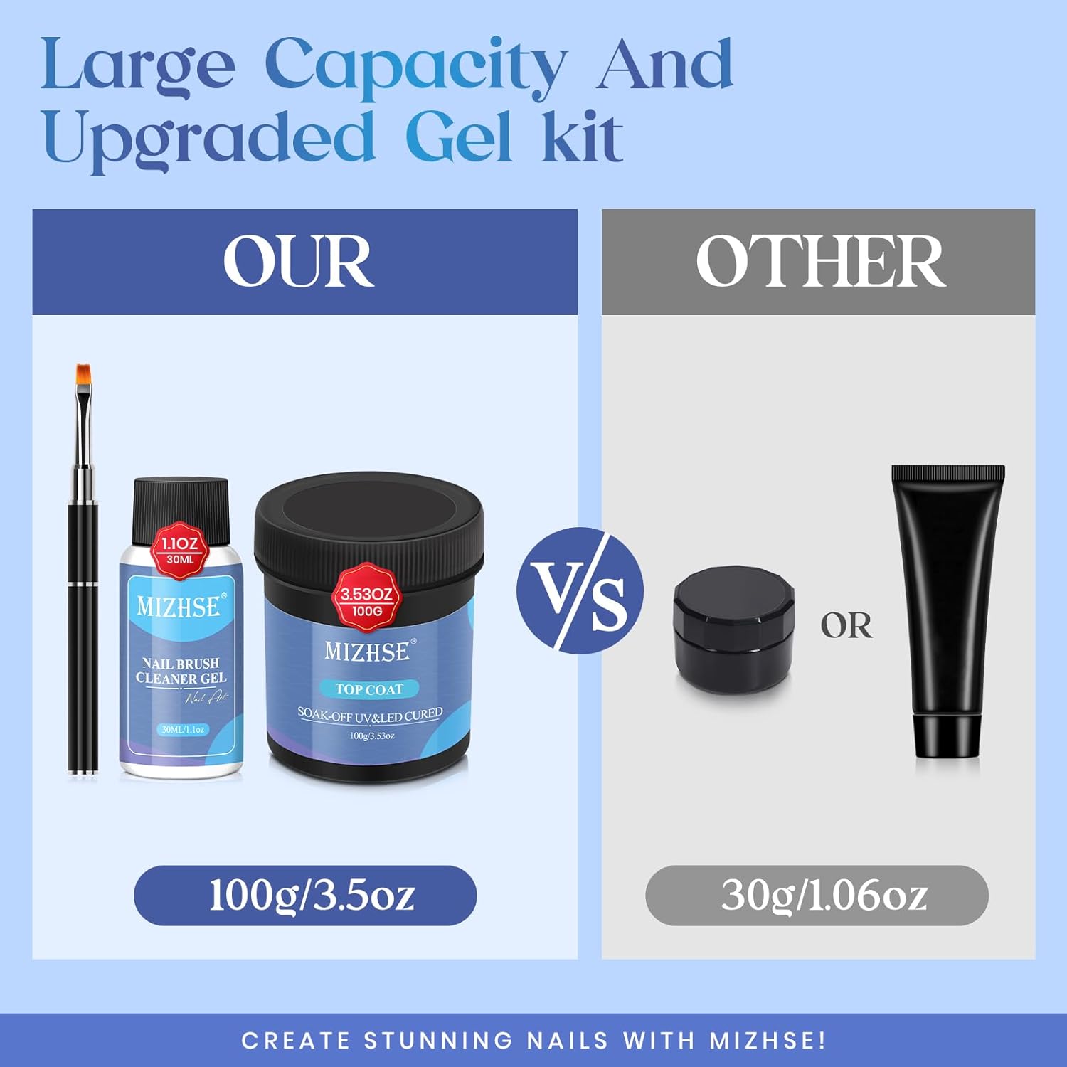- Lager Capacity Gel Top Coat: MIZHSE's upgraded 3.5oz/100ml top coat gel kit with 70% more capacity than other brands, can be used 300+ times and is great value for money. This nail top coat kit includes 100ml top coat gel, 30ml brush Cleaner Gel, and Nail Art Brush. Payless and get more