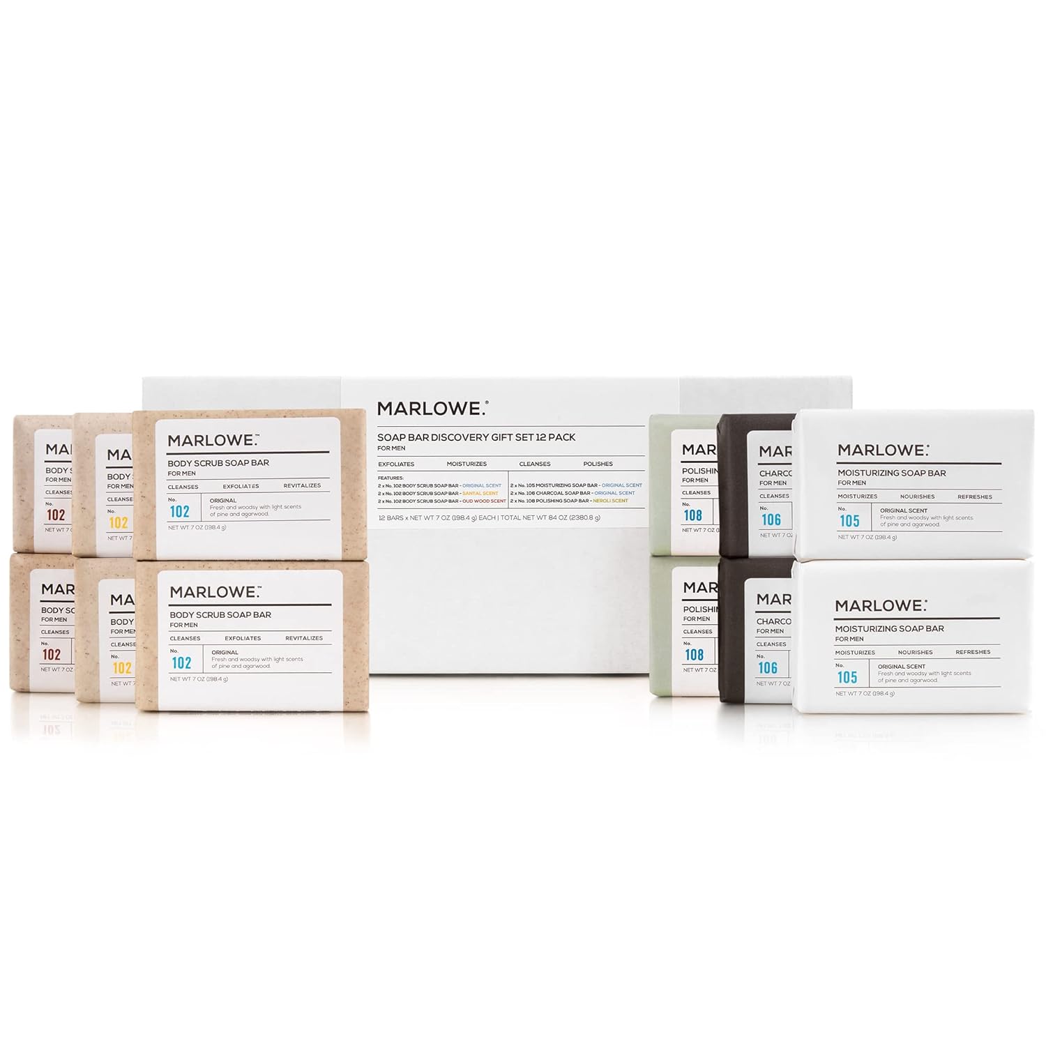 MARLOWE. Soap Bar Discovery Gift Set, Mens Skin Care Variety Selection of Exfoliating Body Scrub, Charcoal, Moisturizing & Polishing Body Bar Soaps for Men, 12 Pack