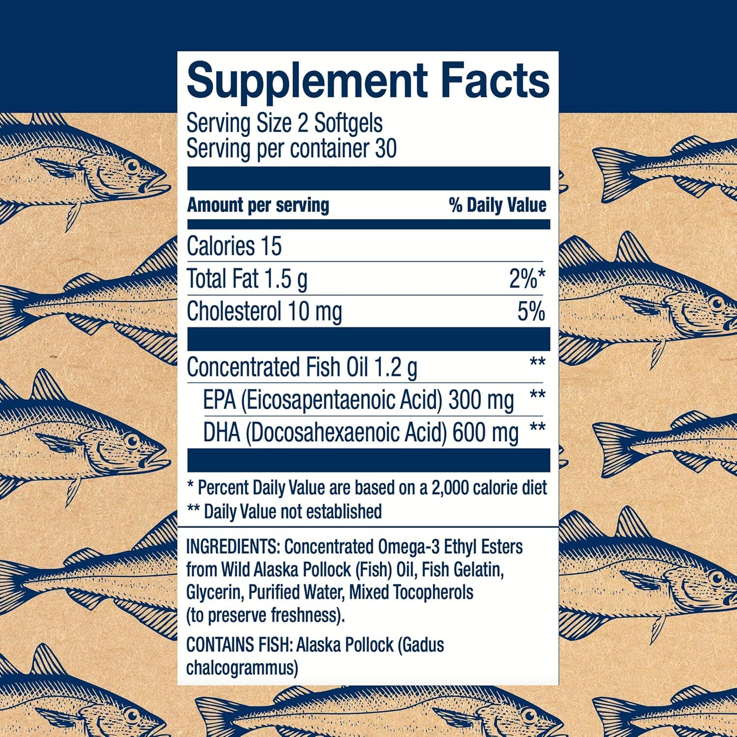 - DHA for Omega-3s: This fish oil supplement has 600mg DHA and 300mg EPA for a total of 900mg of wild-caught Alaskan Pollock omega-3 in just 2 softgels per day