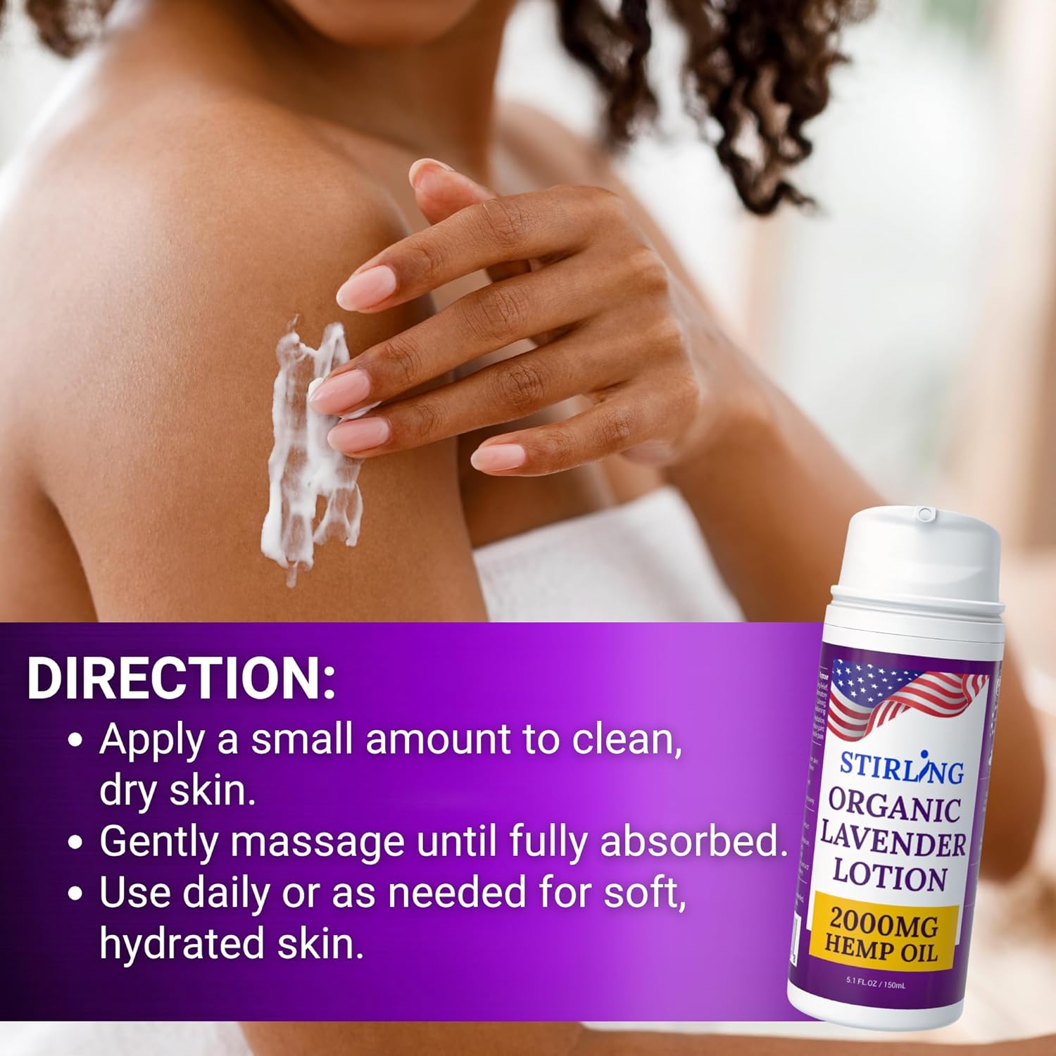 STIRLING Lavender Lotion β Organic Lavender with 2000mg Hemp Oil, Aloe Vera, and Vitamin E β Nourishing and Moisturizing Body Lotion for a Soft and Smooth Feel