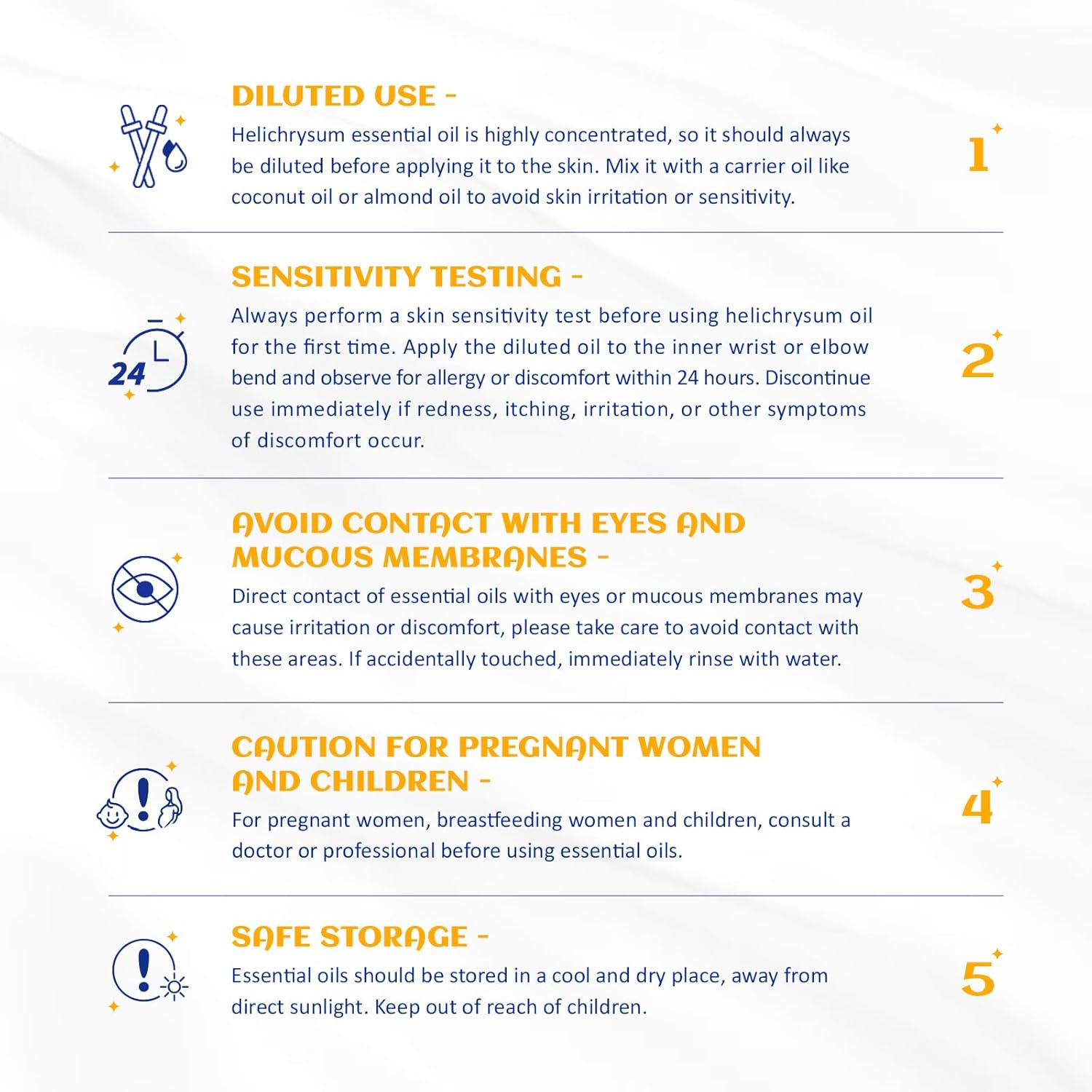 - Multiple Blend: Helichrysum essential oil can be blended with Bergamot, Chamomile, Geranium, Frankincense, Lavender, Sweet Orange, Rose essential oils. Dilute with carrier oil before use. Test on feet first for skin sensitivity prior to widespread use