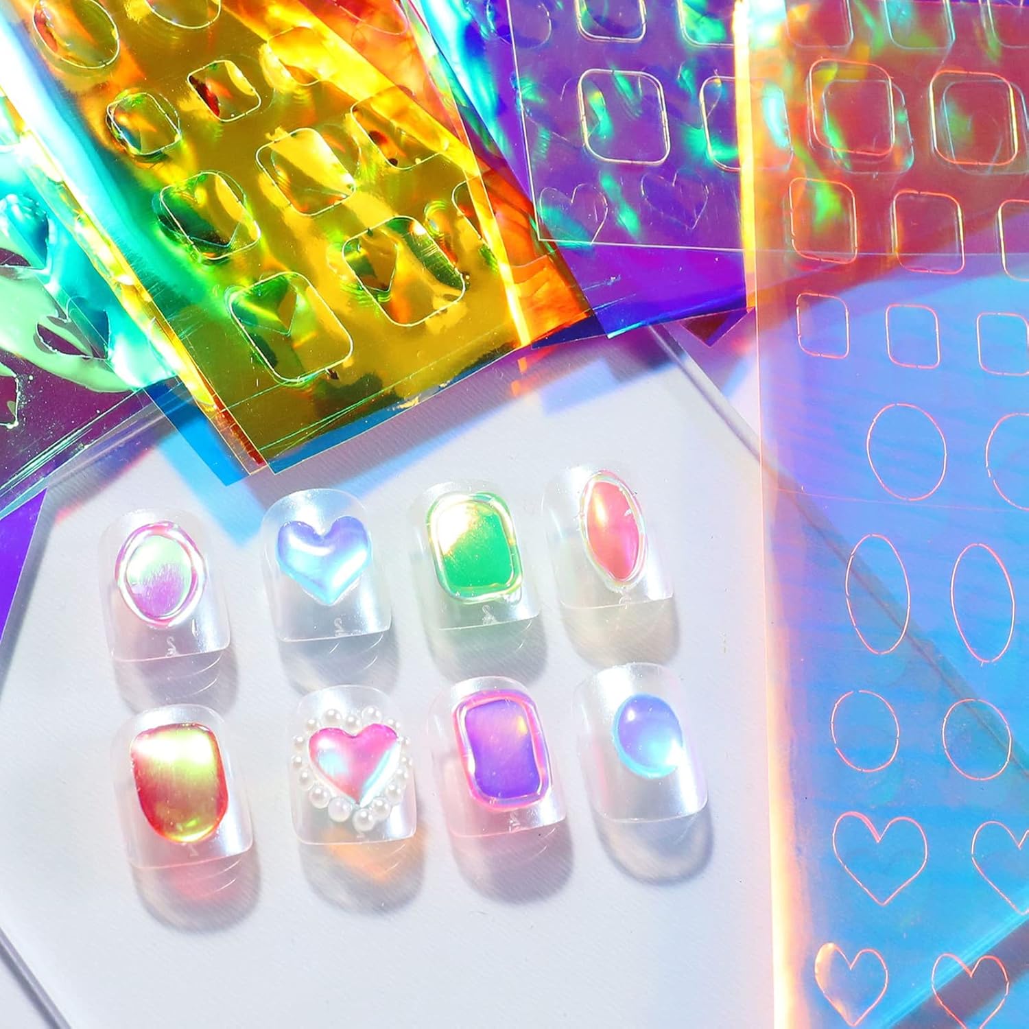 - Various Shapes: The nail art foil stickers include a variety of different Shapes, such as square, oval, heart, and 11 different colors, show aurora-like colors from different angles to make your nails unique.