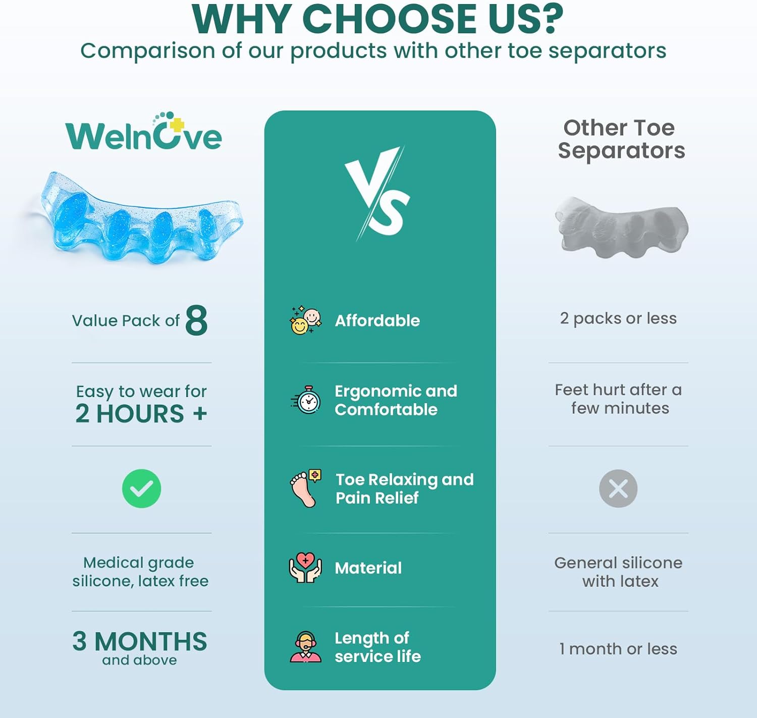 - [Keep Toes Straight & Healthy]: Welnove gel toe Separator help reduce rubbing and release pressure by providing cushion and strong enough to correct improper alignment.