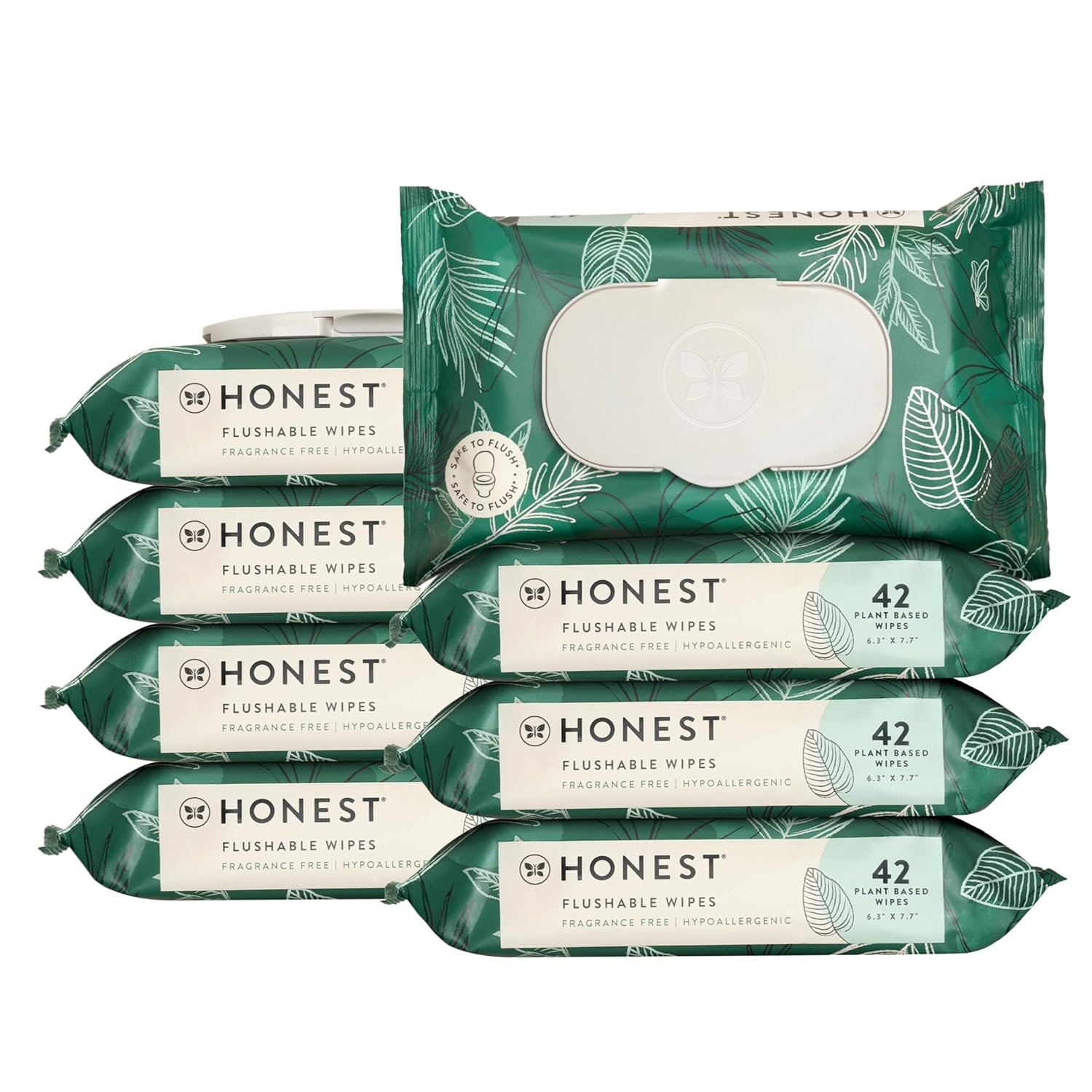 The Honest Company Flushable Wipes for Sensitive Skin | Fragrance Free, Hypoallergenic, 99% Water, Safe to Flush | pH Balanced Feminine Wipes | Tropical Leaves, 336 Count