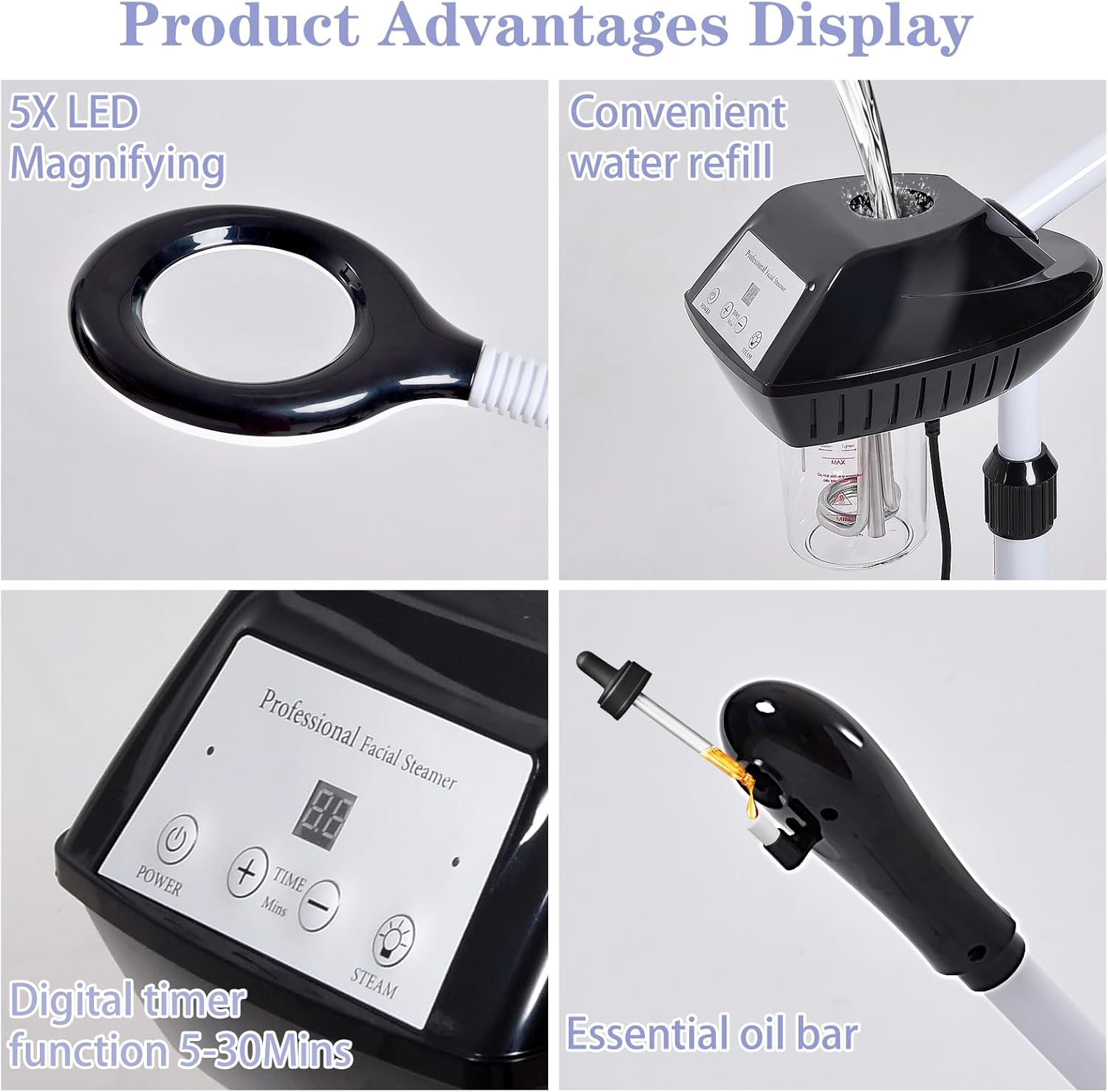 - 【5X Magnifying Lamp Facial Steamer】Face steamer with 5x magnifying lamp, led light and flexible adjustable arm, suitable for professional esthetician operation.