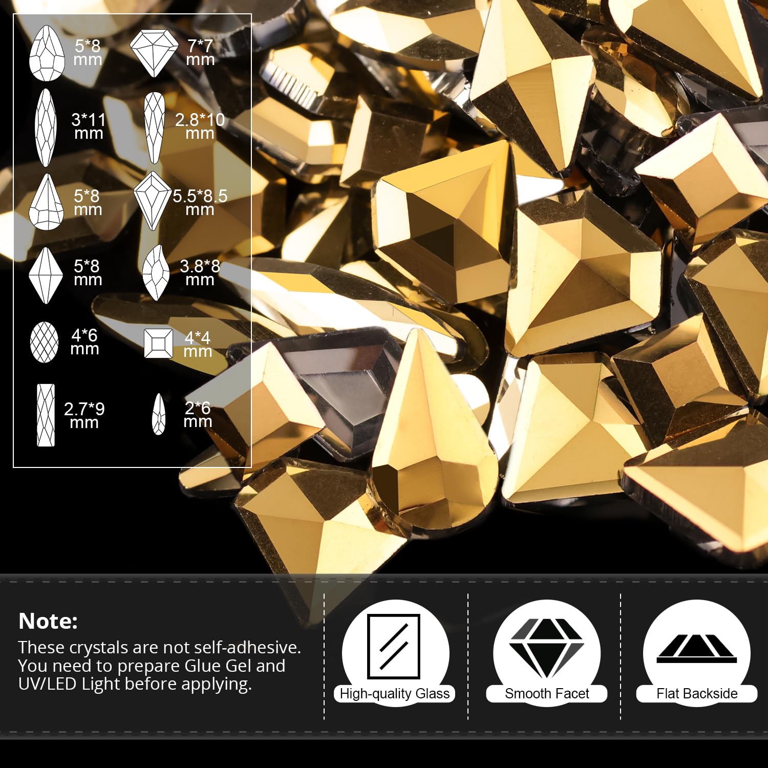 - 💎PREMIUM GLASS & MULTIPLE SHAPES: The diamonds in mineral gold color that can make your nails shiny and gorgeous are made of durable, high-quality glass - superior to resin and acrylic. And 1 box of multishaped mineral gold color diamonds is contained, such as horse eye, oval, rectangle, water drop, and rhomb rhinestones. All the nail crystals are featured with exquisite shapes and cutting facets.