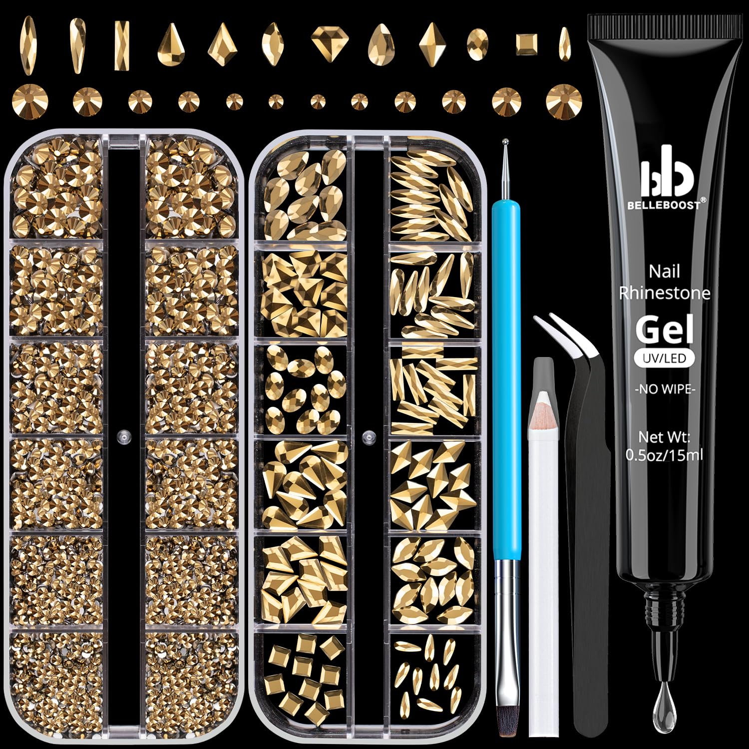 - 💎NAIL ART KIT: You will receive one box of round flatback glass nail charms in mineral gold color (2/2.4/2.8/3/4/5mm) and one box of multishaped flatback glass nail charms in mineral gold color. The functional tool kit for nail design is attached as well, which carries 1pcs 15ml rhinestone glue gel, 1pcs dual-end brush & dotting pen, 1pcs pickup pencil, and 1pcs tweezer.