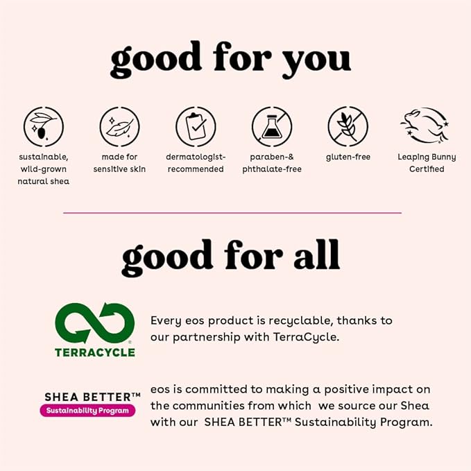 - MADE WITH SUSTAINABLE SHEA: Shea is a sustainable, renewable natural resource and through our Shea Better Sustainability program, eos is committed to making a positive impact on the communities from which we source our shea.