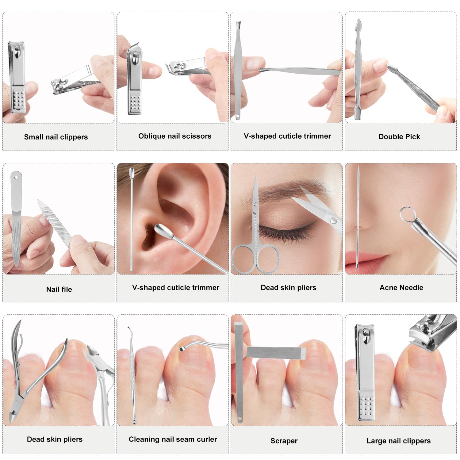 - Manicure Set:manicure and beauty kit contains 12 kinds of care tools for hands and feet,multifunctiona include hand care,facial care,foot care tools,can meet all of you needs, Nail Kit, Manicure Kit, Nail Care Kit For Men.