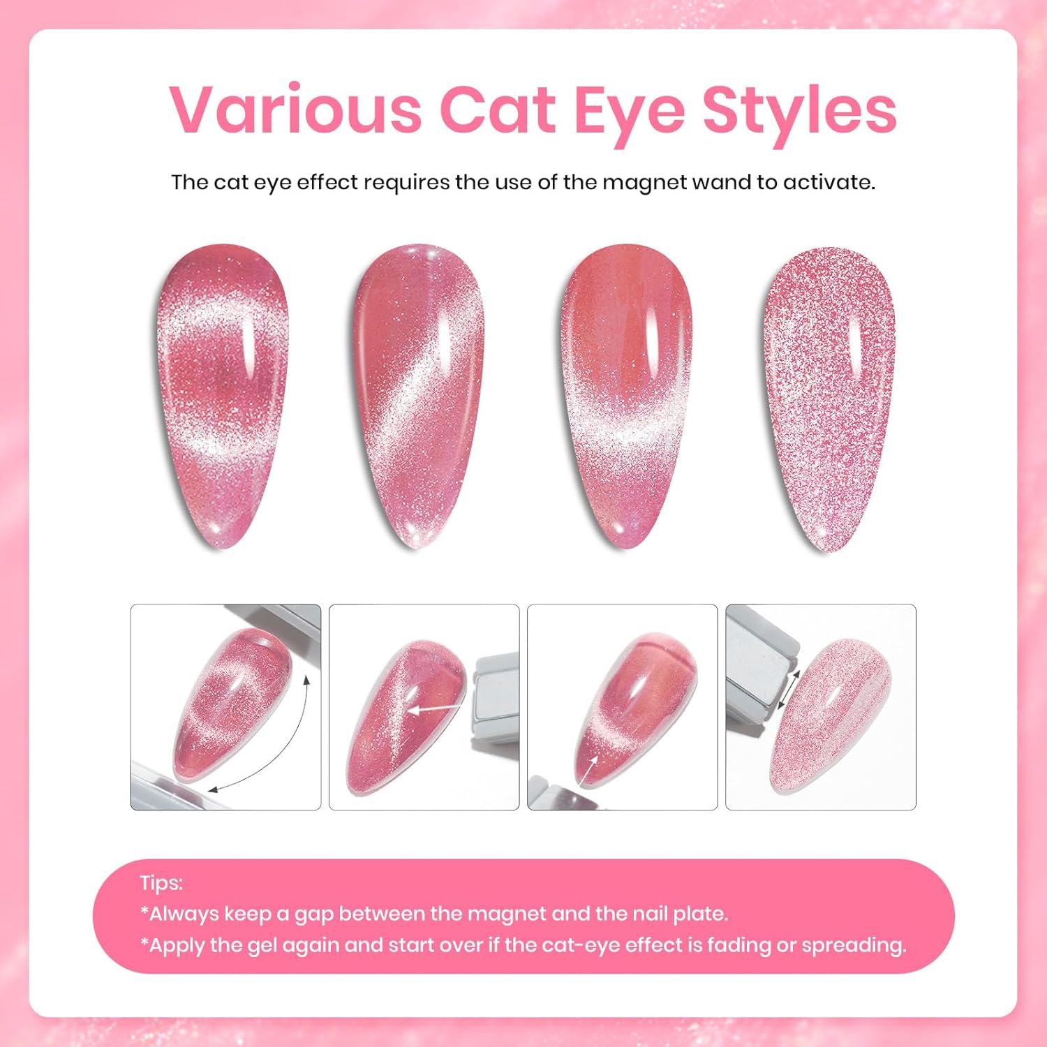 - 【Warm Tips】Please conduct a skin test before use with glitter pink cat eye gel nail polish. Professionally formulated and only used for nails. Place the magnetic stick over the surface about 3-5mm for 5-10 secs to get your desired effect! After repeatedly sucking the cat eye color gel without any effect, the magnetic powder will become ineffective. You can add a layer to suck the cat eye gel again