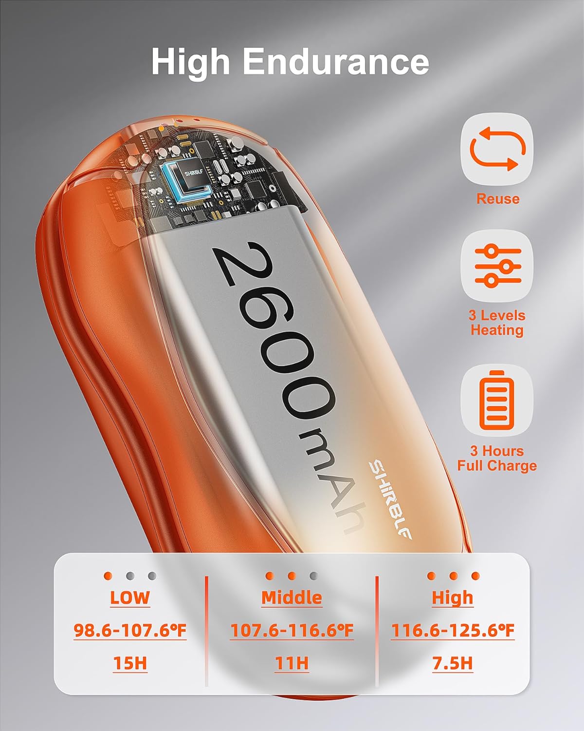 - 【Three Seconds Quick Heat】There is an on button on the top of the electric hand warmers rechargeable, press and hold for three seconds and the reusable hand warmer will turn on the heating to 105.8℉-114.8℉-125.6℉. Adjust the suitable temperature according to different temperature needs.