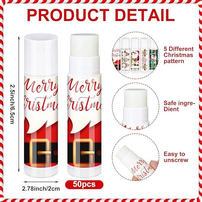 - Bulk Package Plus Variety: offering not just one but a pack of 50 Christmas lip balms, this product ensures that you will never run out during the holidays; This plentiful package also includes 5 different flavors for you to choose; It offers variety as it fulfills the daily requirements of you and your loved ones; Exceptional and diverse, these lip balms offer an experience for everyone's preference